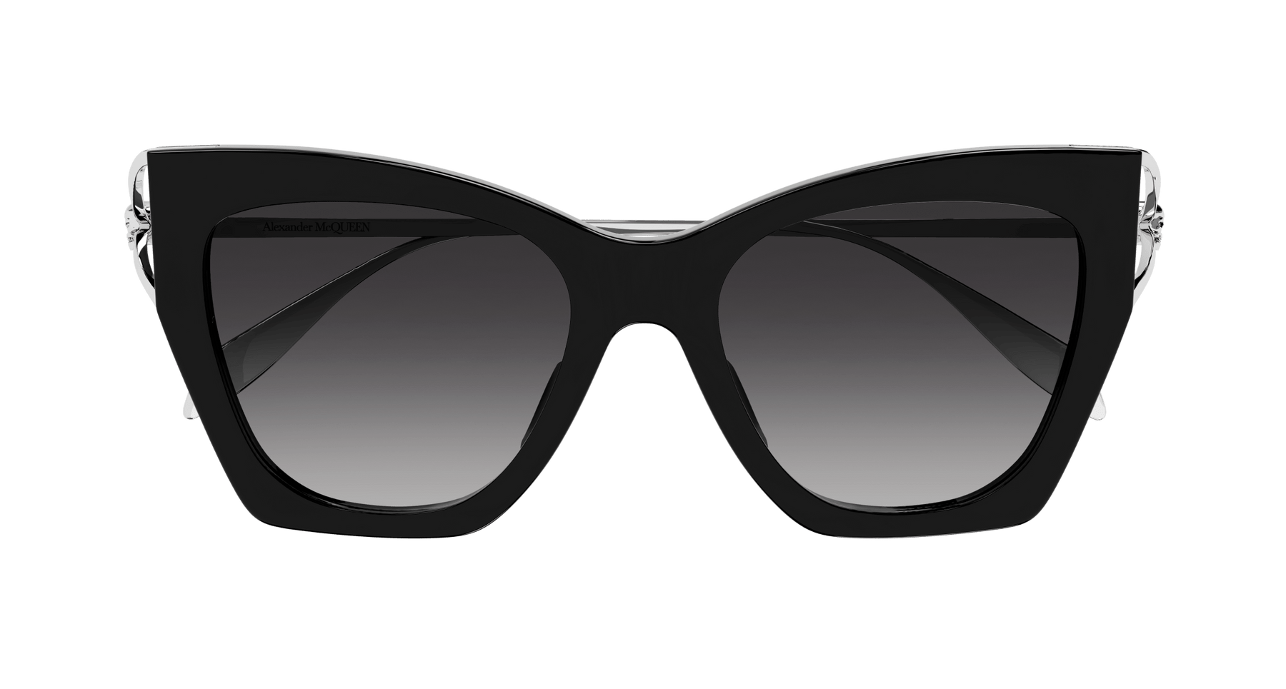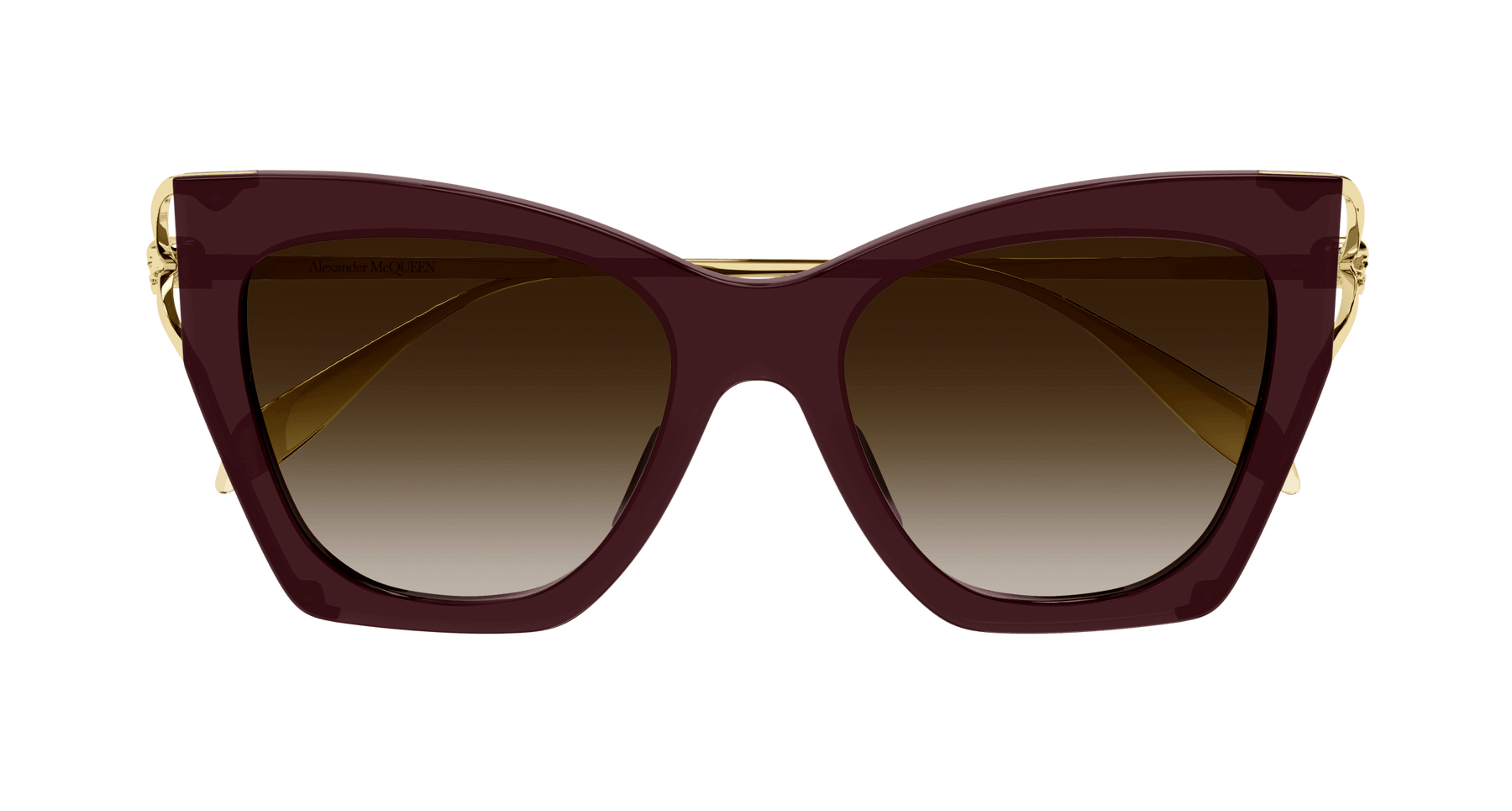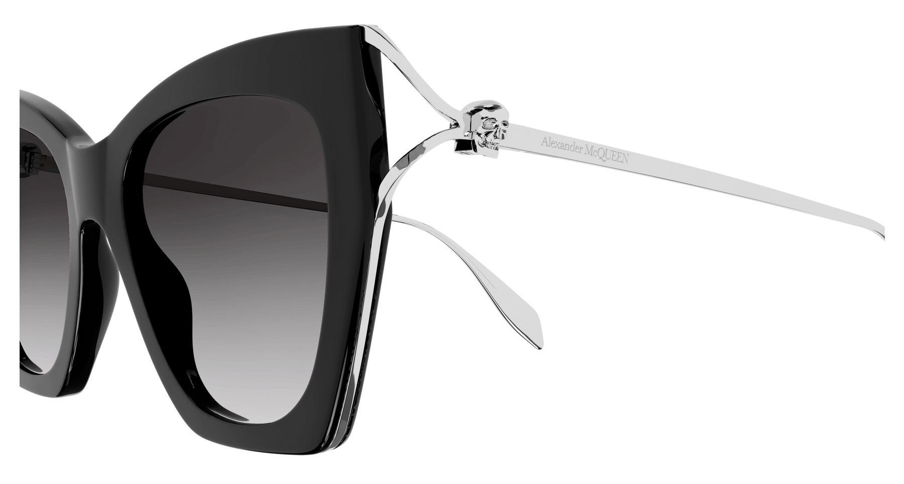 Skull Hinge family pairs the fork element with the skull, iconic signature to the Alexander Mcqueen offer, proposing it as subtle yet recognizable touch. Feminine cat eye with acetate front and metal temple featuring a fork construction ending with a skull. The Alexander McQueen logo is lasered on the temples. Shiny gold and silver temples are matched with either classic or fashionable front tones and gradient lenses.