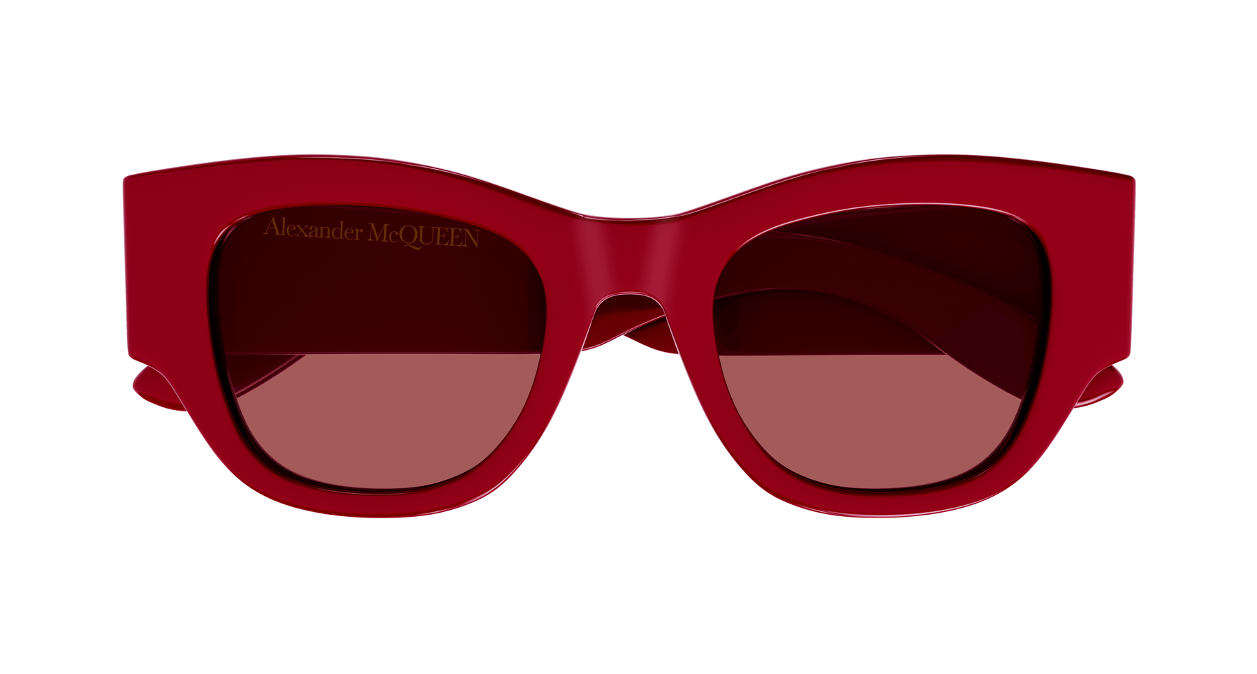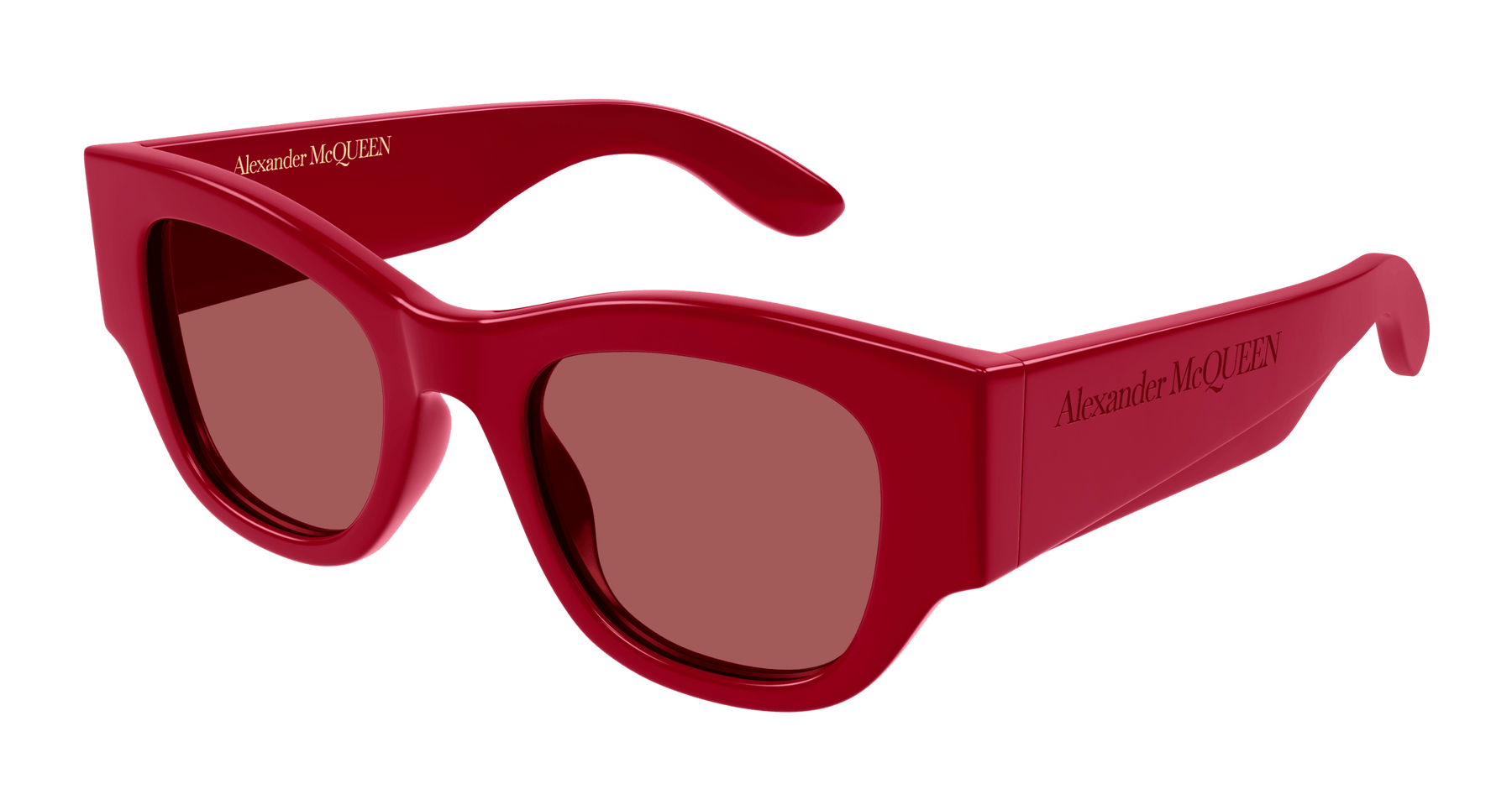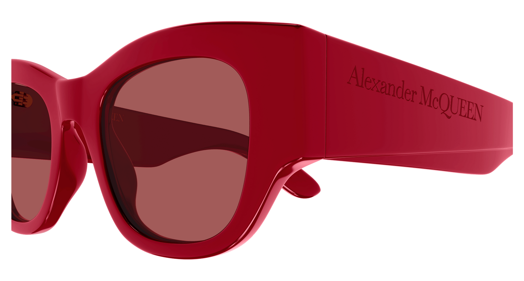 Taking the 50's look like inspiration, this family has been designed with McQueen's rock soul in mind: bold vintage shapes are matched with an undersized look. Feminine cat-eye shape in full acetate with bold temples. The Alexander McQueen logo is lasered on the temples tone-on-tone with the frame. McQueen Angled palette is integral to the House latest launches. It includes shiny classic tones, cherry red and feminine pink.
