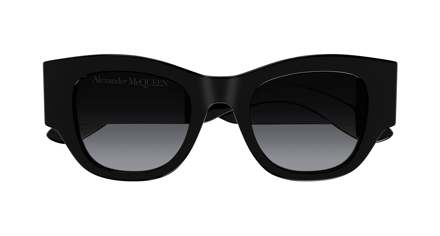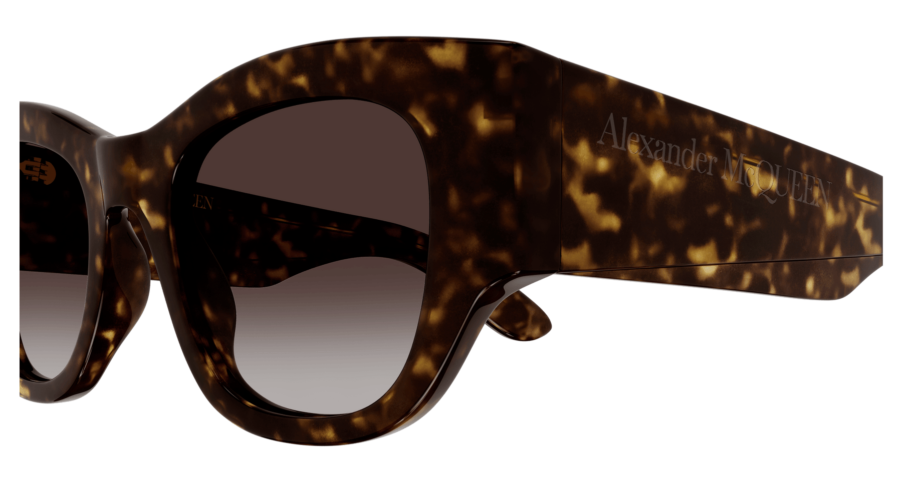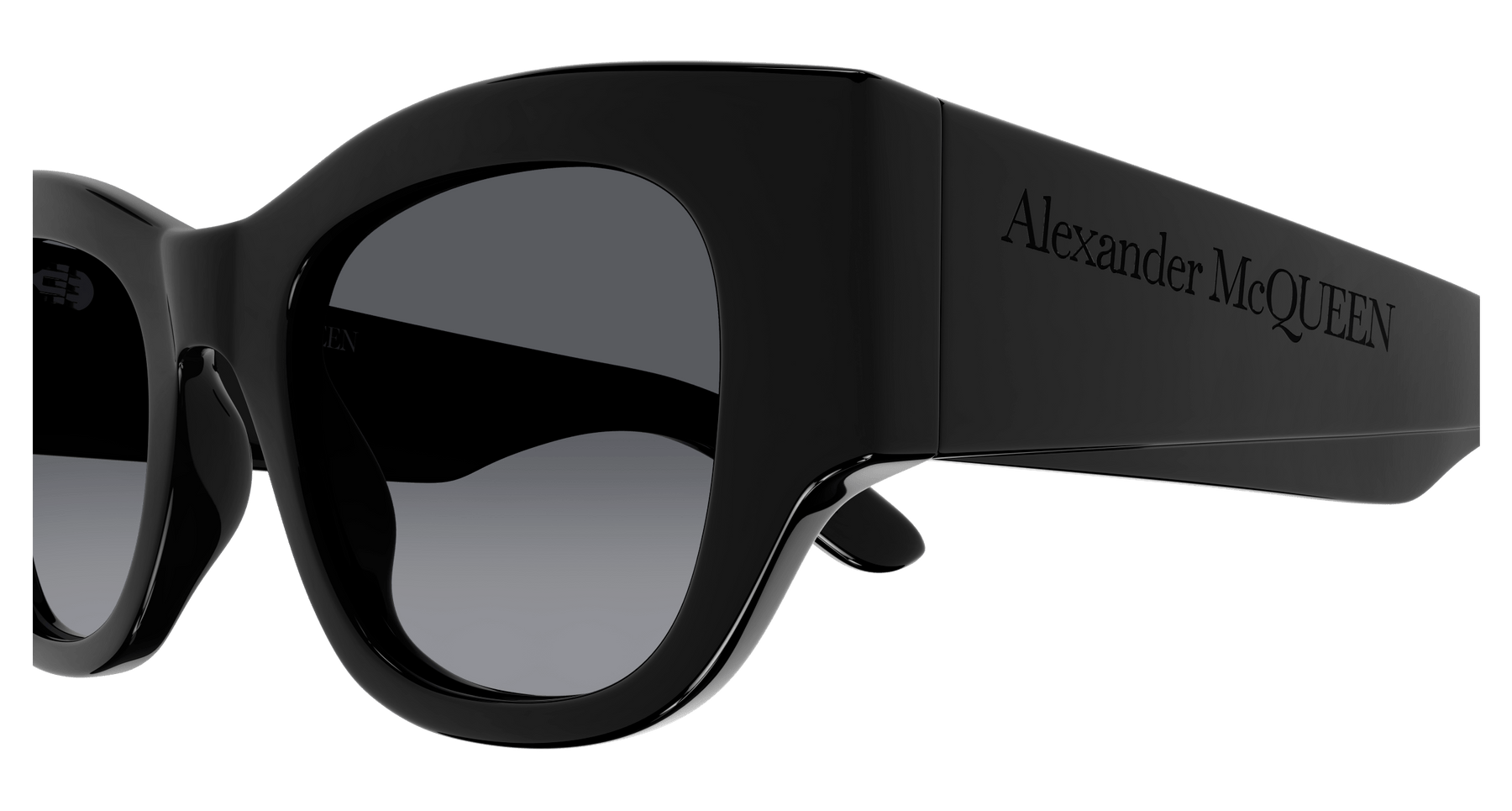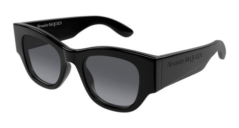 Taking the 50's look like inspiration, this family has been designed with McQueen's rock soul in mind: bold vintage shapes are matched with an undersized look. Feminine cat-eye shape in full acetate with bold temples. The Alexander McQueen logo is lasered on the temples tone-on-tone with the frame. McQueen Angled palette is integral to the House latest launches. It includes shiny classic tones, cherry red and feminine pink.