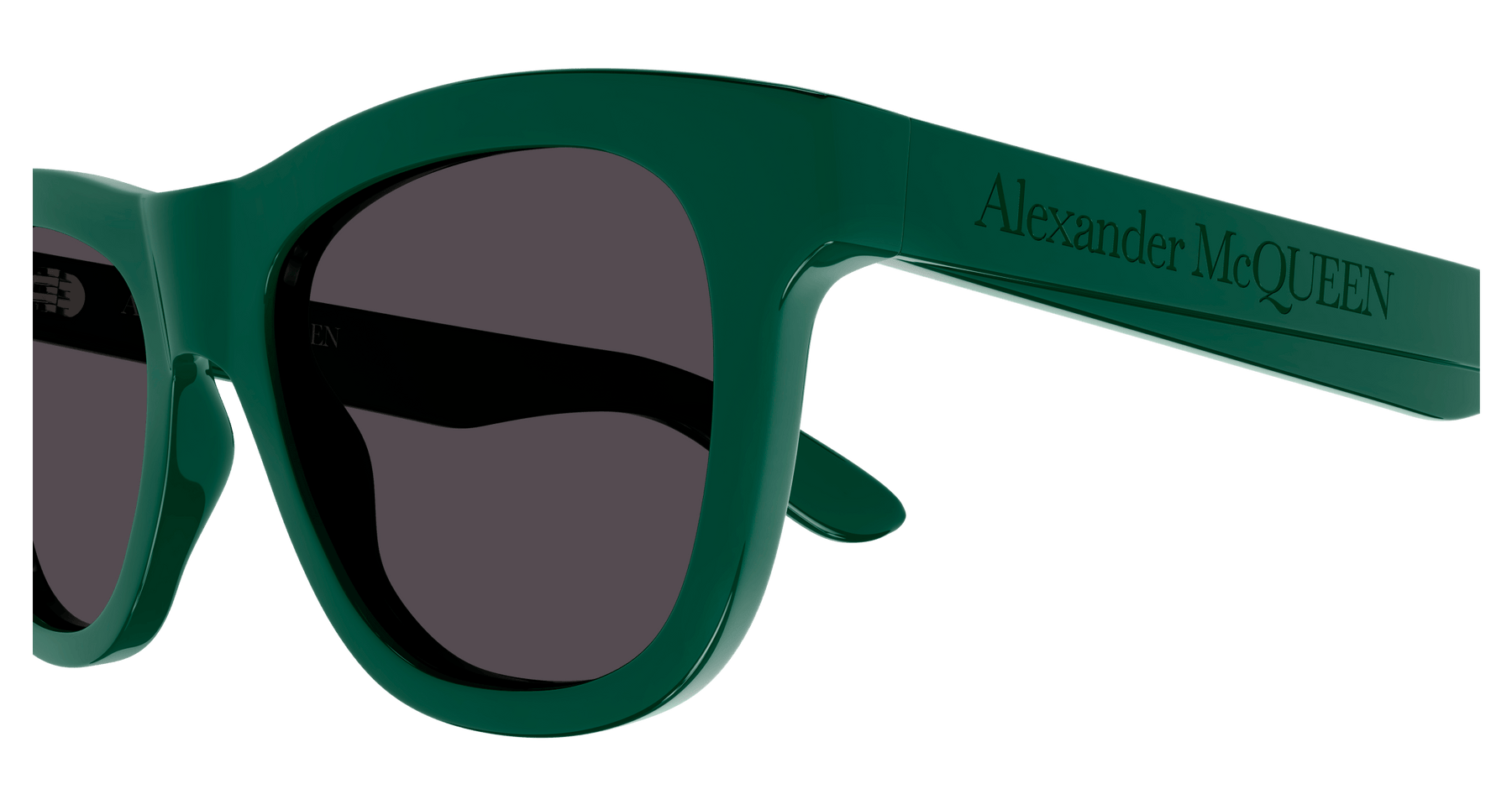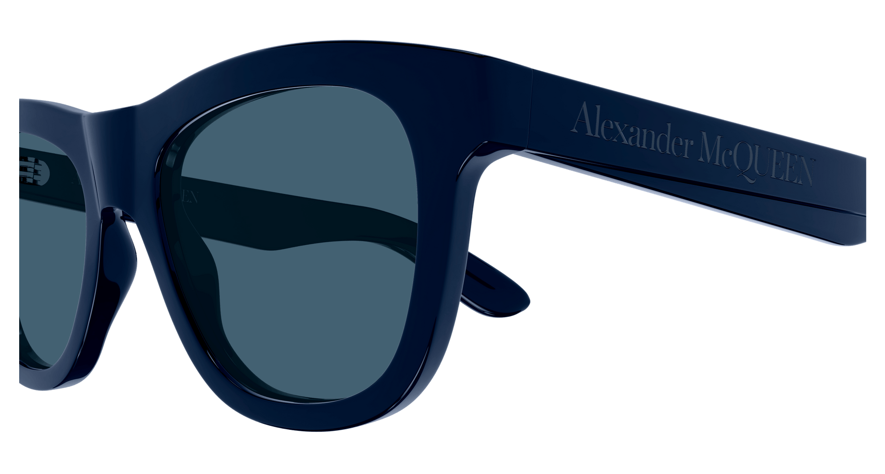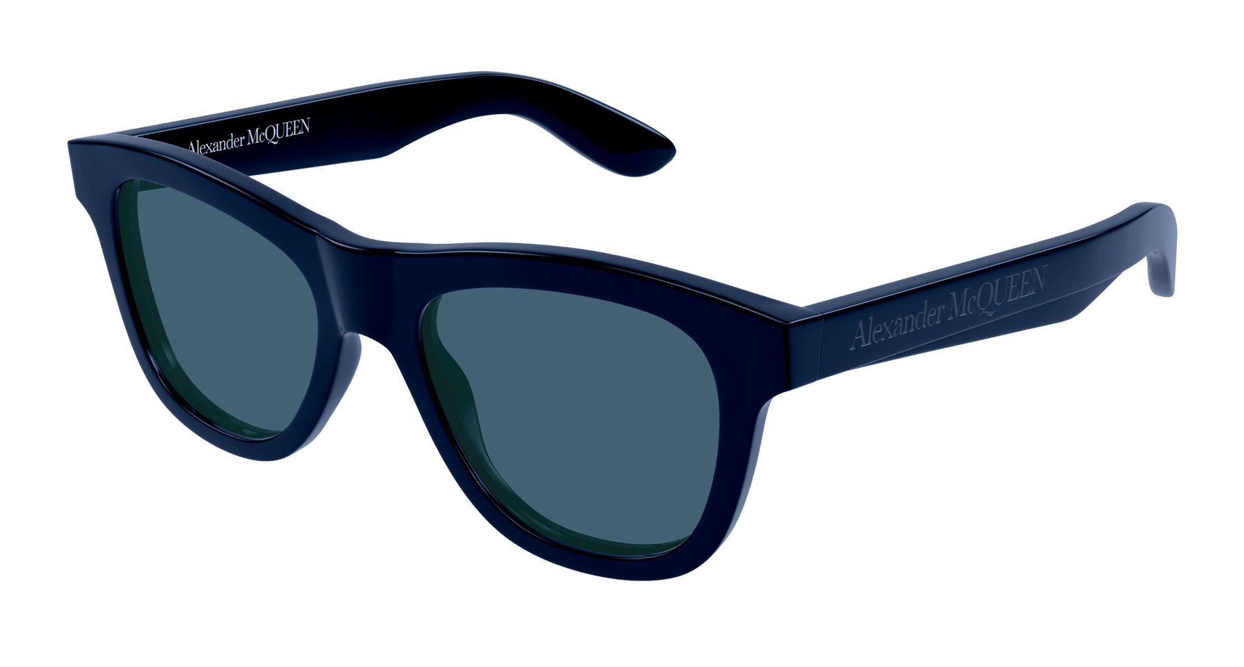 Taking the 50's look like inspiration, this family has been designed with McQueen's rock soul in mind: bold vintage shapes are matched with an undersized look. Masculine vintage inspired shape in full acetate. The Alexander McQueen logo is lasered on the temples tone-on-tone with the frame. McQueen Angled palette is integral to the House latest launches. It includes shiny classic tones, green and blue.