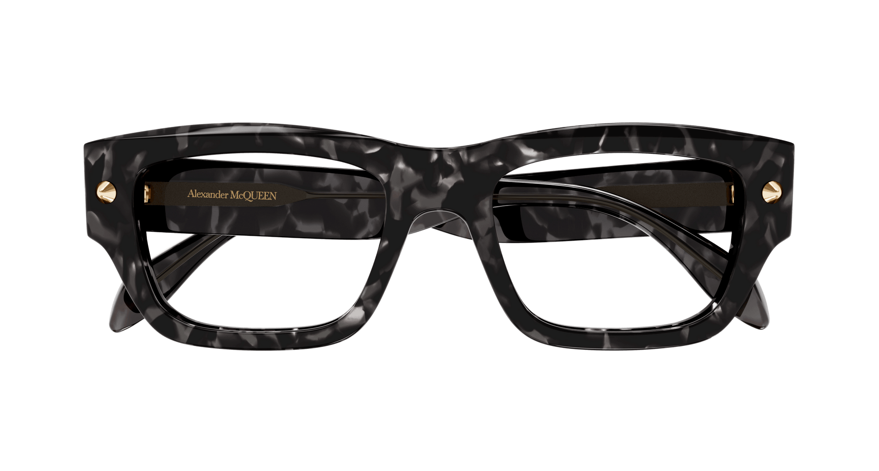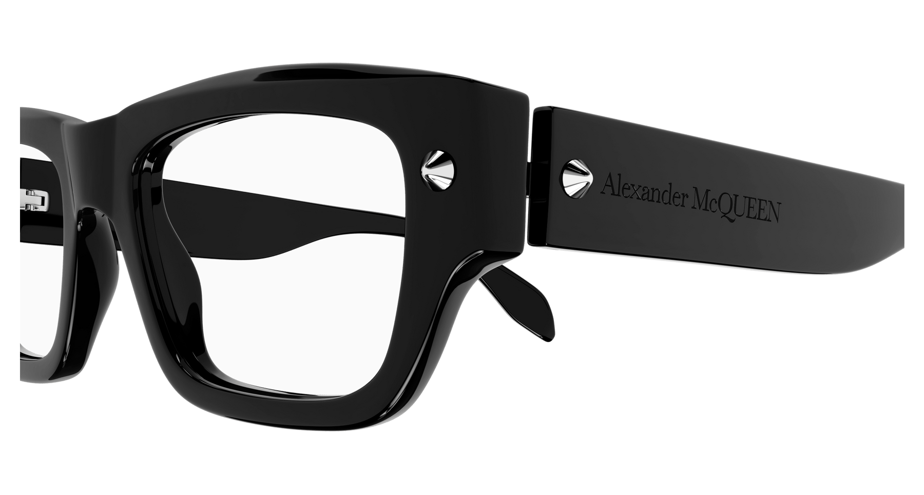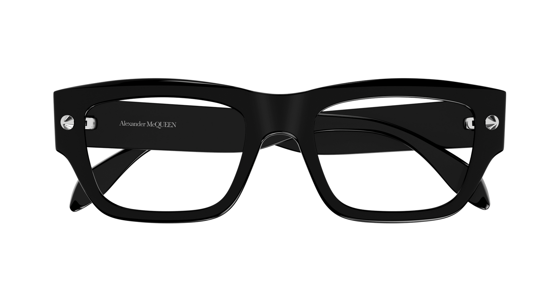 As a strong recognizable iconic detail, studs are central to the McQueen house representing a full expression of rebellion at the heart of the McQueen spirit. Unisex rectangular easy-to-wear style in bold acetate enriched with iconic spike studs fully integrated as functional element of the hinge construction. The Alexander McQueen logo is lasered on the temples. The color palette includes dark color animation.
