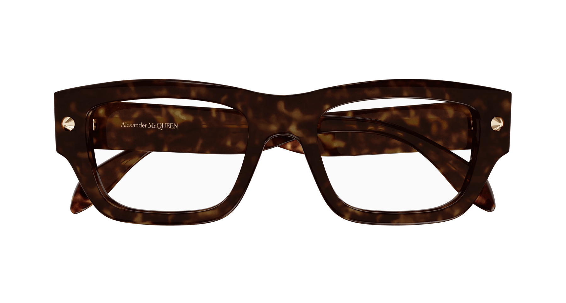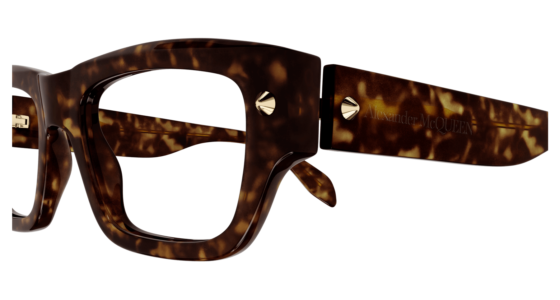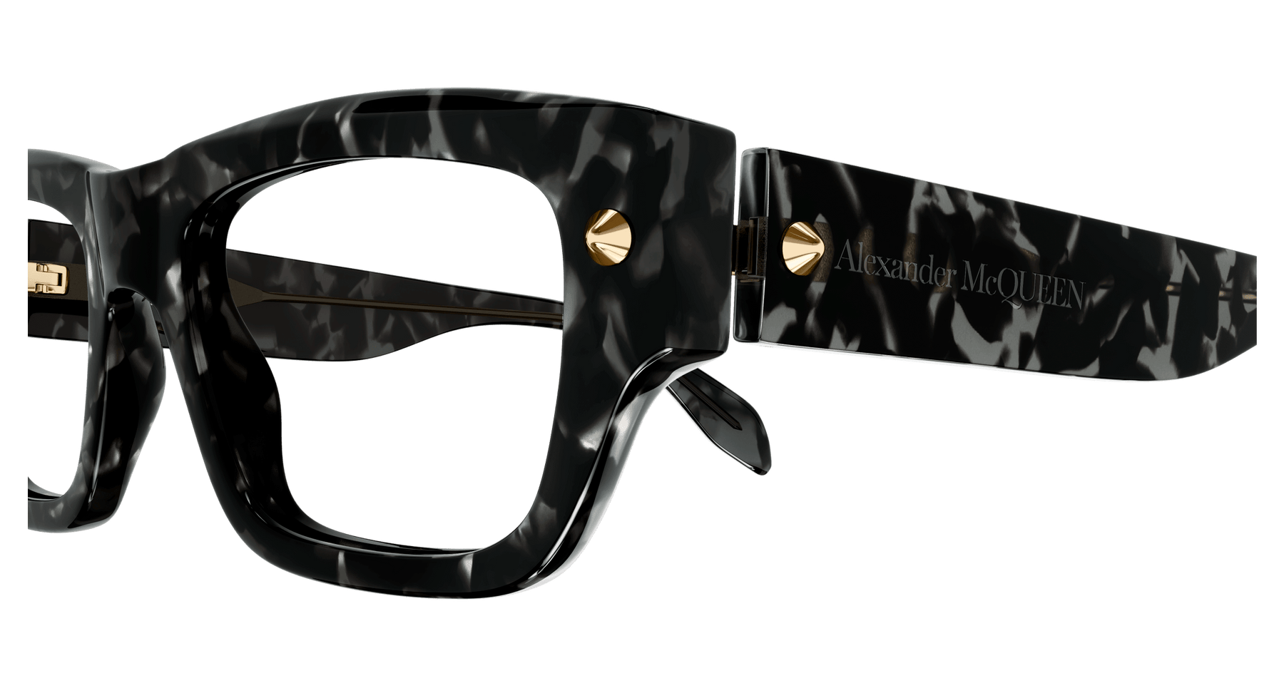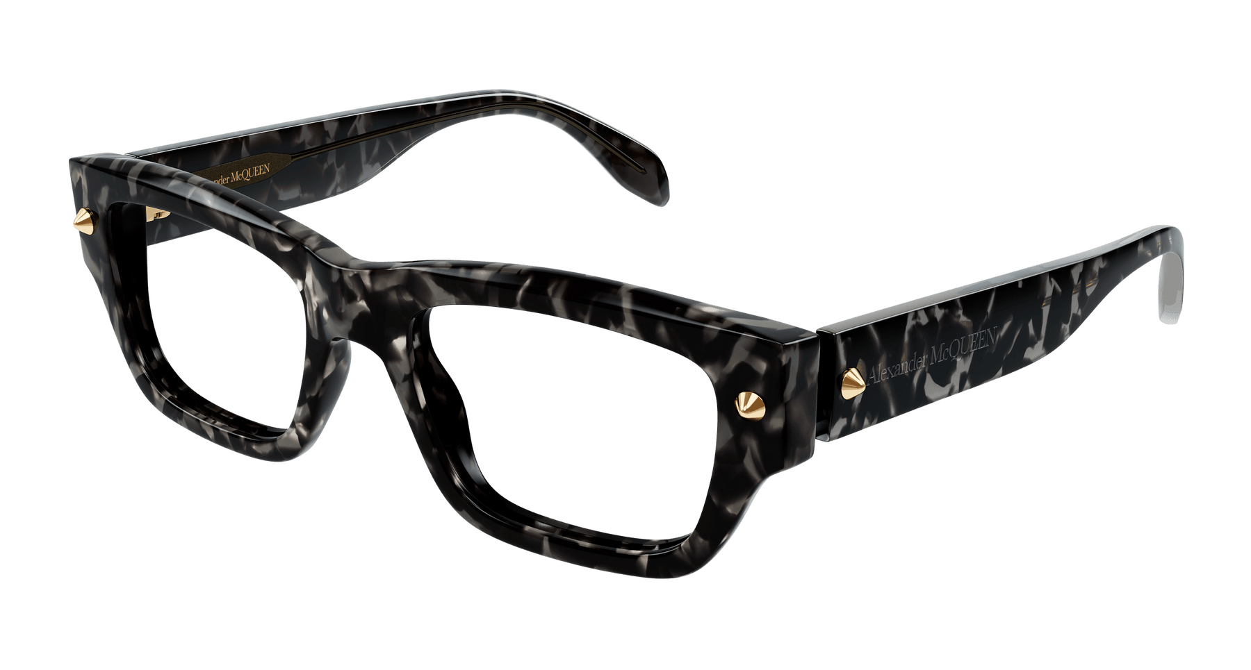 As a strong recognizable iconic detail, studs are central to the McQueen house representing a full expression of rebellion at the heart of the McQueen spirit. Unisex rectangular easy-to-wear style in bold acetate enriched with iconic spike studs fully integrated as functional element of the hinge construction. The Alexander McQueen logo is lasered on the temples. The color palette includes dark color animation.