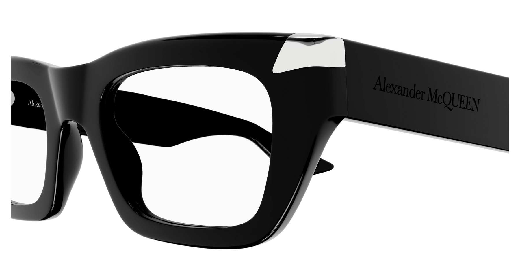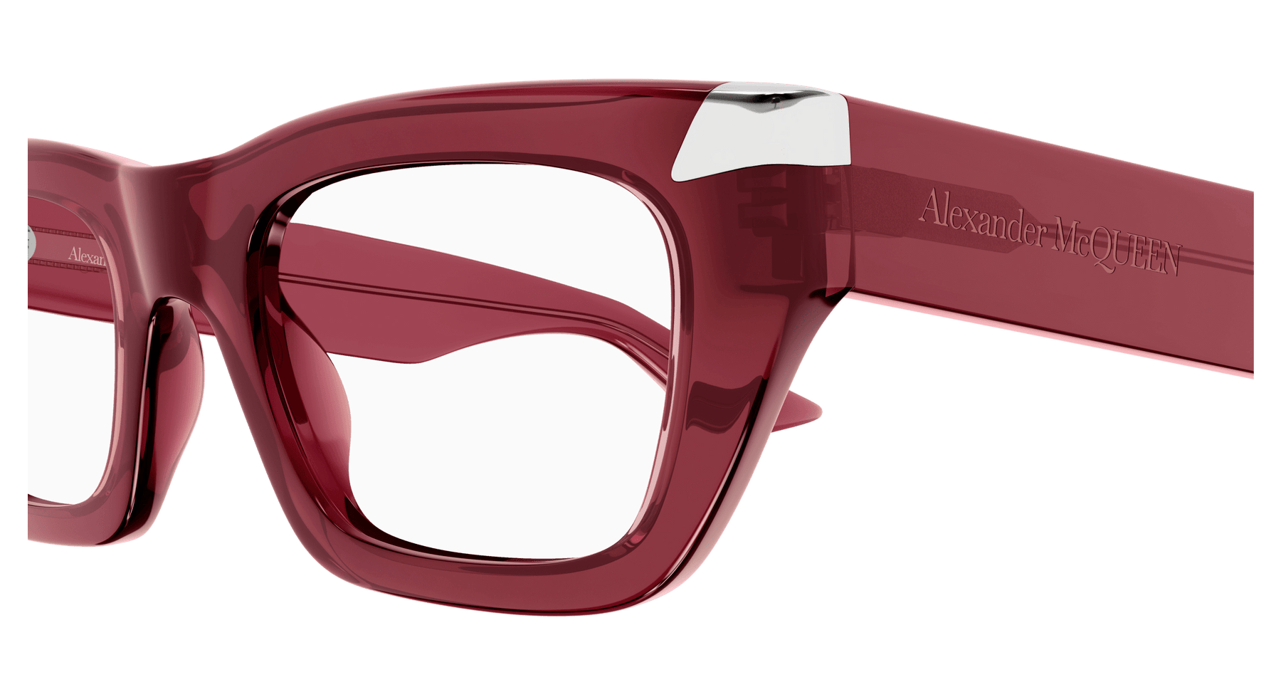 Punk Rivet is a new development of the iconic McQueen’s signature: Studs. inspired by the metal inclusions that distinguish McQueen’s stylistic approach, this new family features the iconic metal details creating a new interpretation of McQueen’s rebellious soul. Modern rectangular shape for both man and woman. Full acetate embellished with silver/gold rivets on the endpieces. The Alexander McQueen logo is lasered on the temples tone on tone. The color palette is characterized by commercial colors in contrast with the silver/gold rivets.
