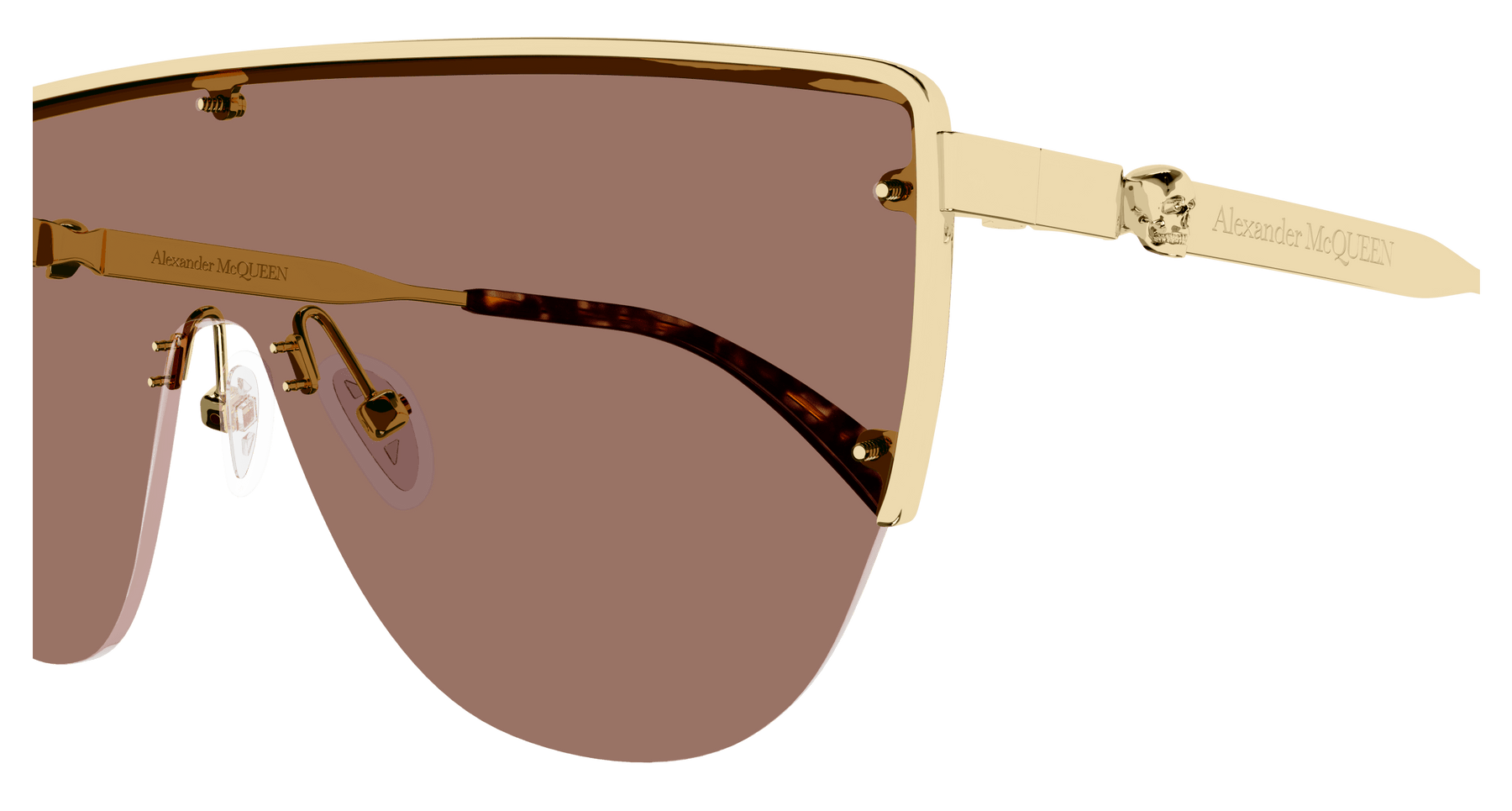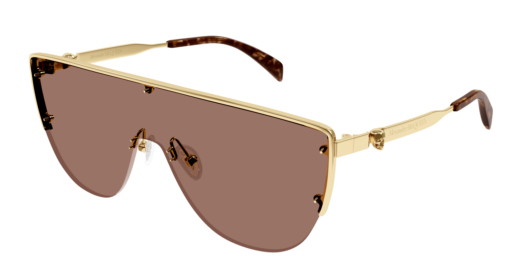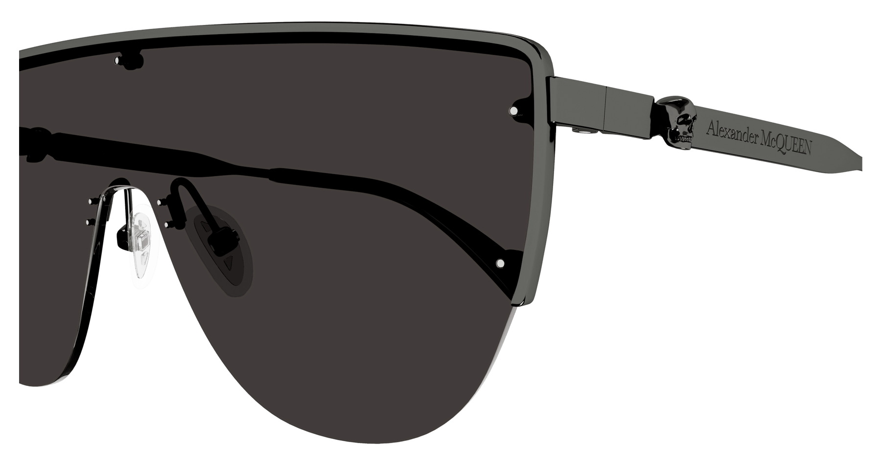 Floating Skull Metal celebrates Alexander McQueen's most iconic symbol with a more subtle touch. Oversize super fashionable mask in full metal featuring a 3D Metal Skull on the temples. The Alexander McQueen logo is lasered on the temples. The color palette includes silver and gold metal frames paired with mirrored or solid colors lenses The endtips are in classic black and tortoise colors.