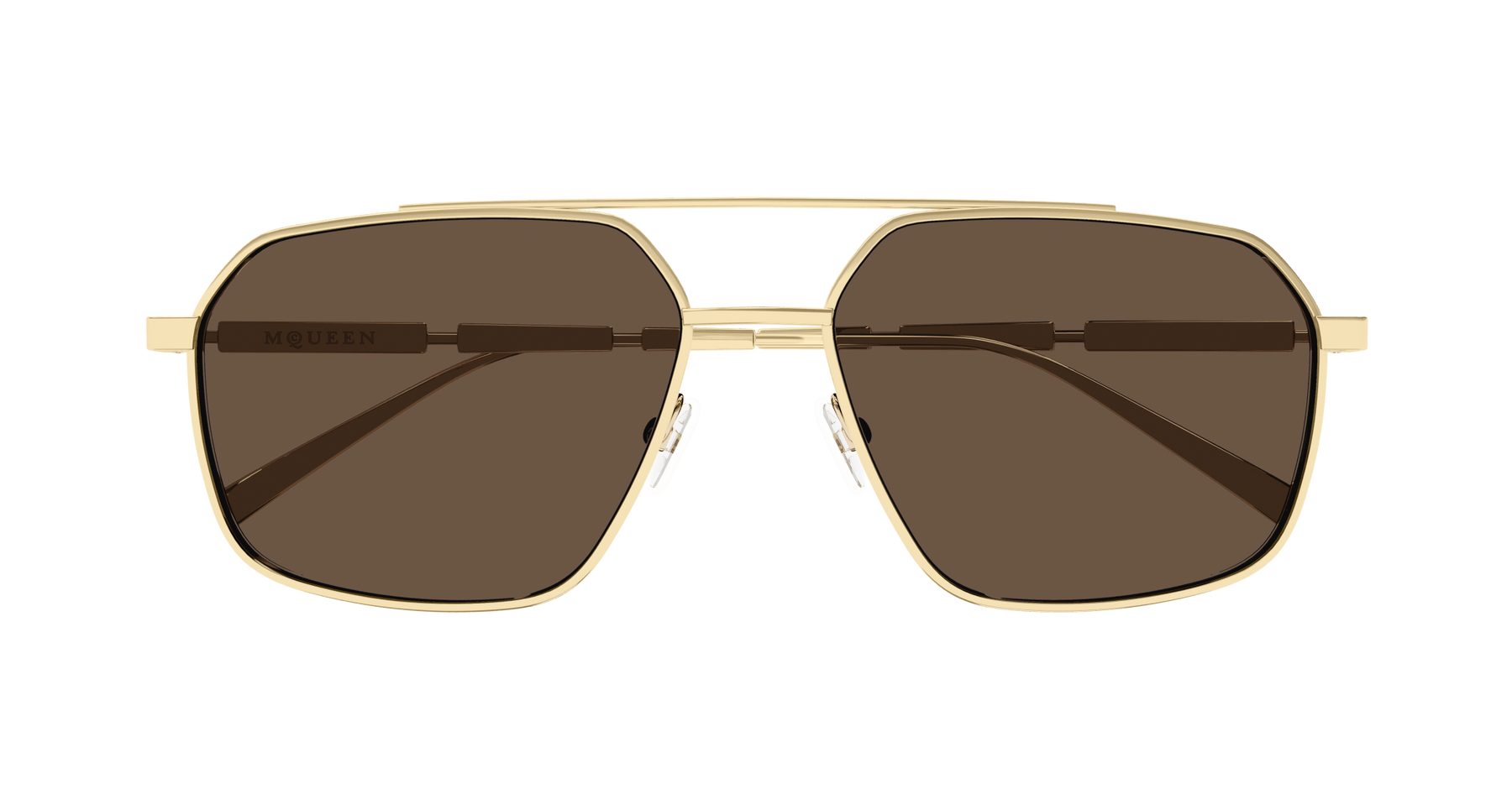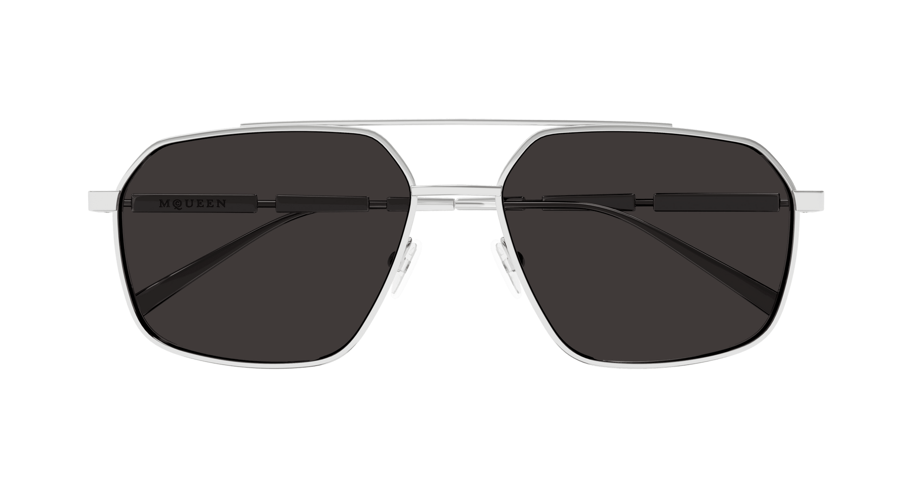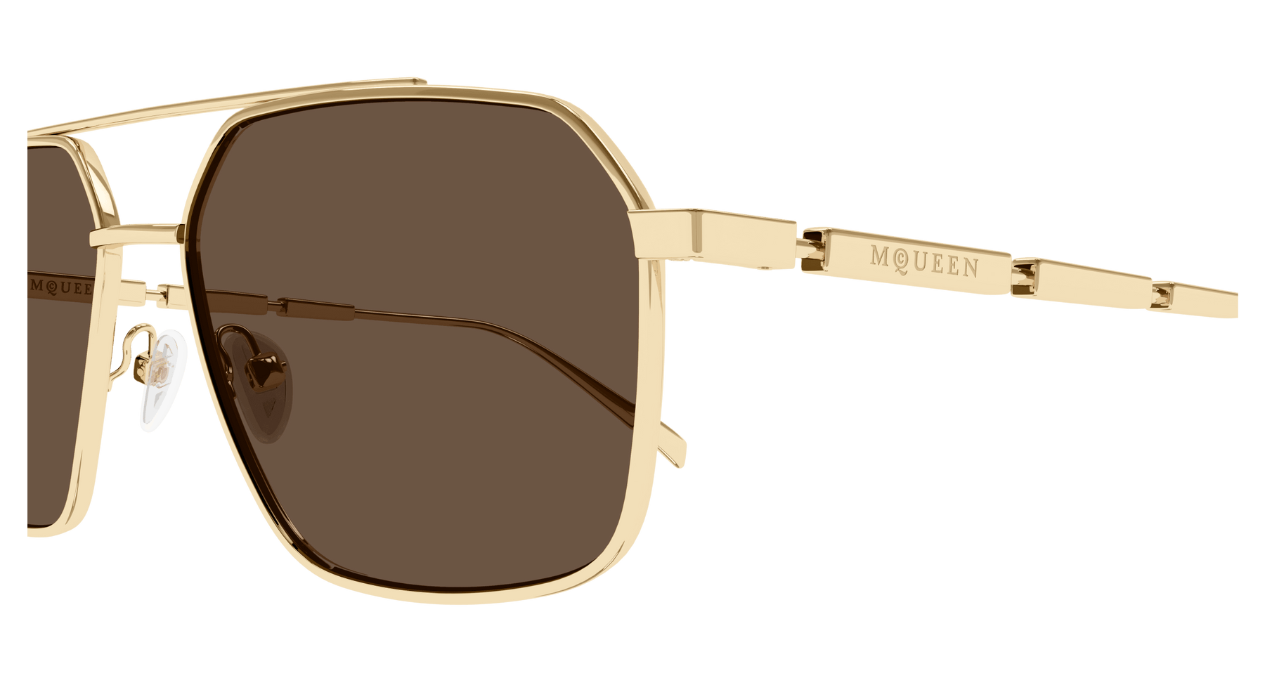 New full metal story entirely dedicated to man. A timeless caravan style featuring a double bridge nose. Outstanding temples embellished with 3 metal plaques. The new McQueen logo is lasered on the first metal plaque.
