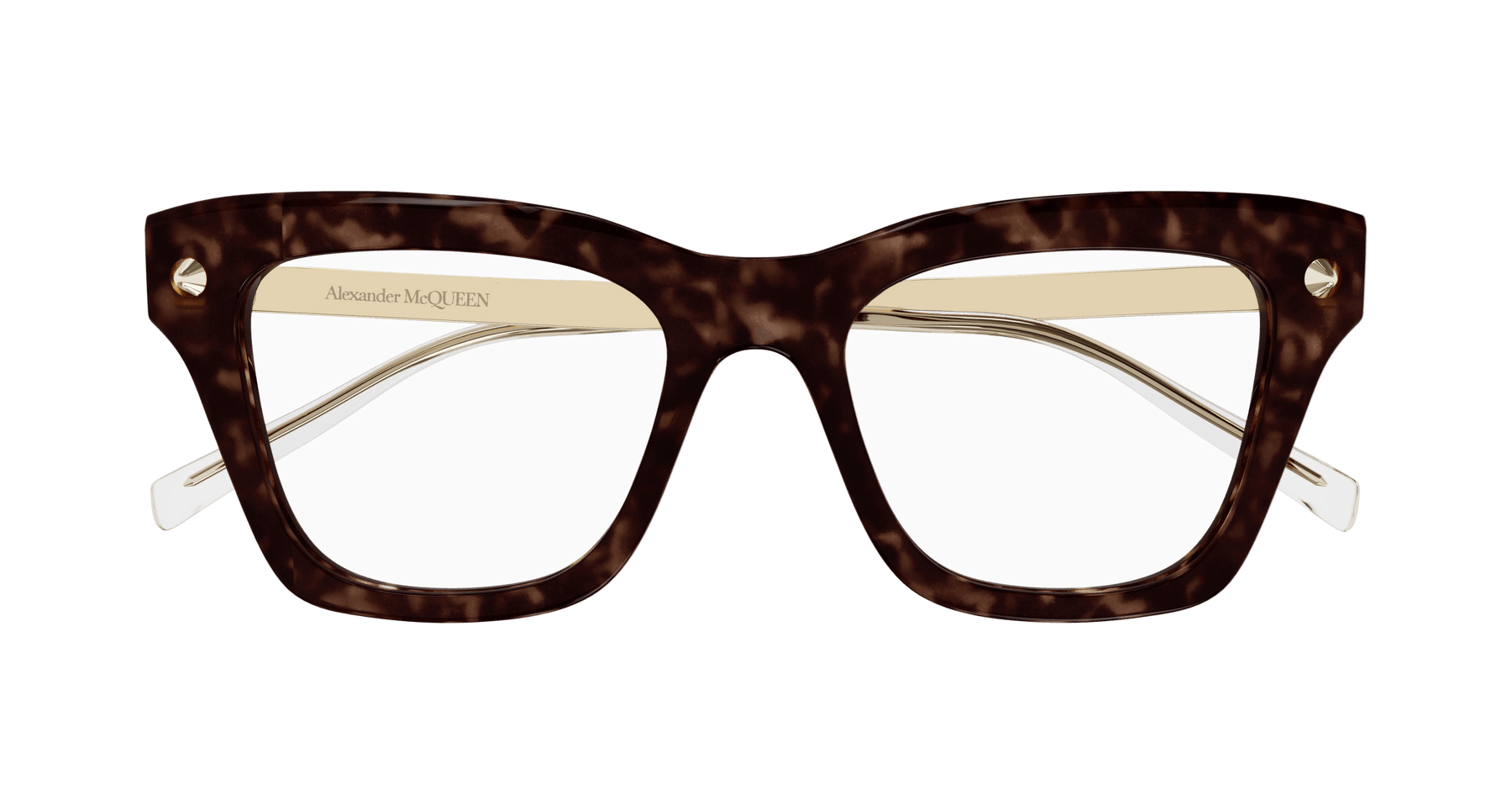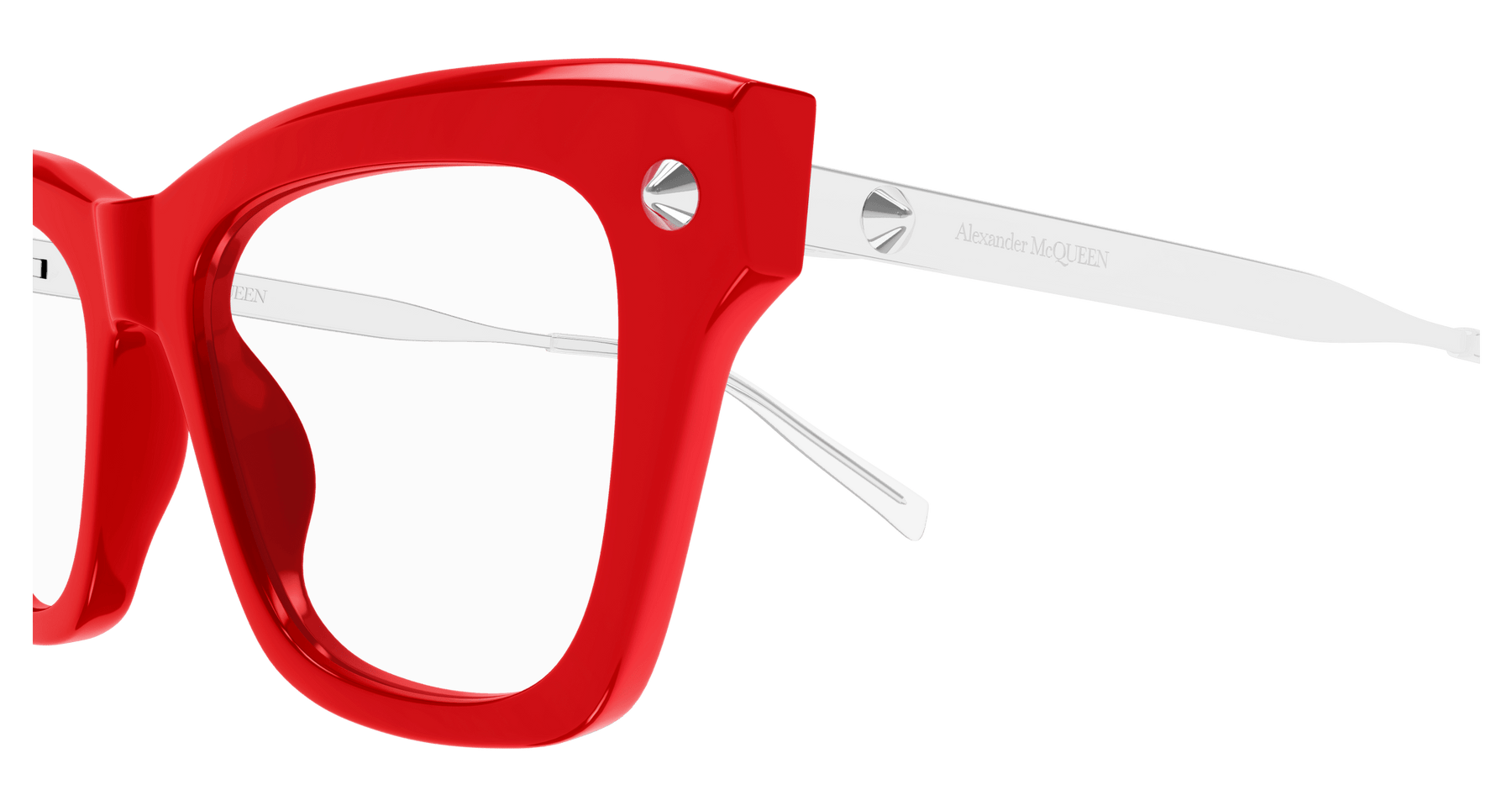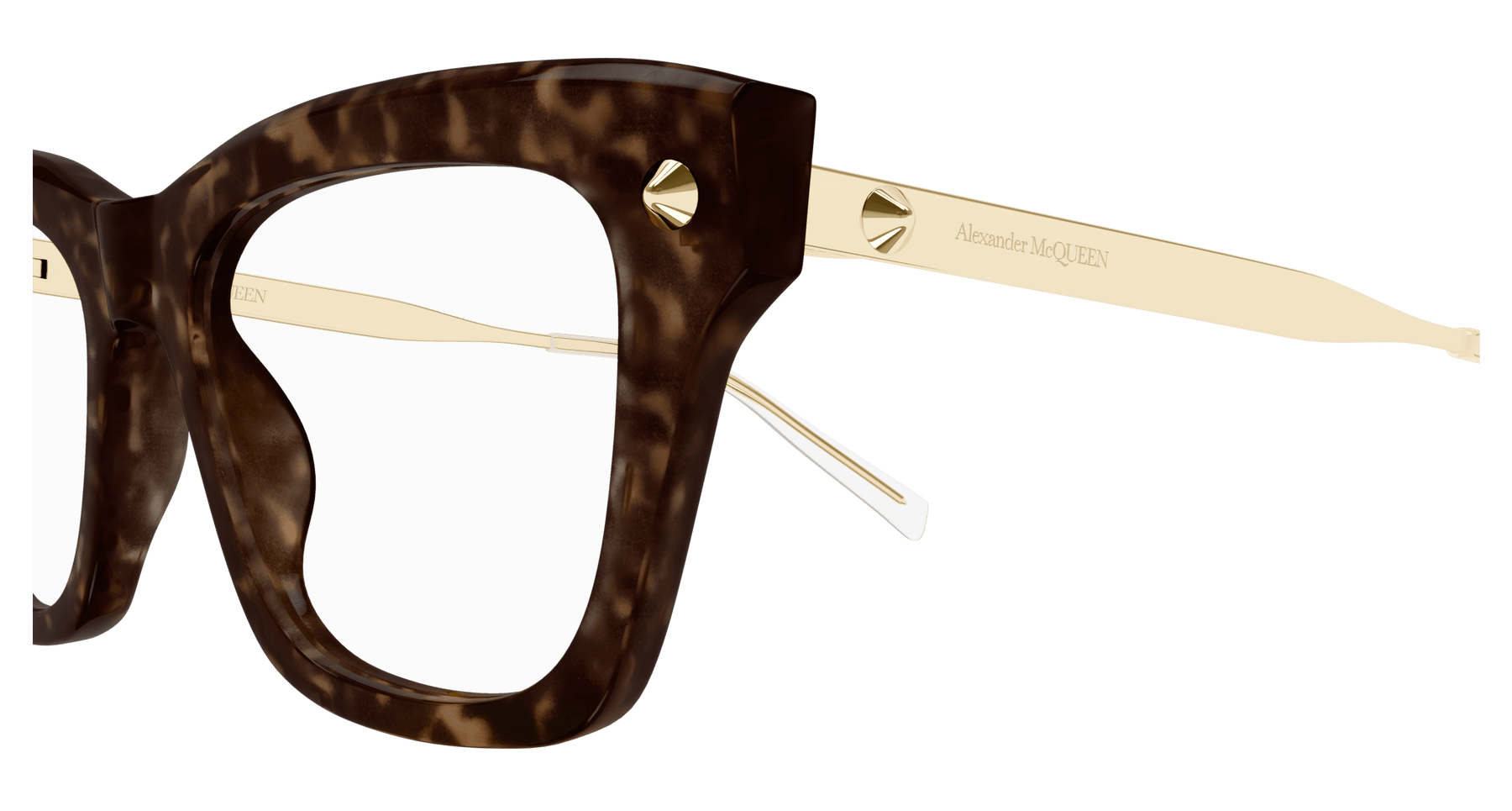 As a strong recognizable iconic detail, studs are central to the fashion house representing a full expression of rebellion at the heart of the McQueen spirit. Feminine large cat eye acetate front enriched with iconic spike studs fully integrated as functional element of the hinge construction combined with metal temples. The Alexander McQueen logo is lasered on the temples tone on tone.