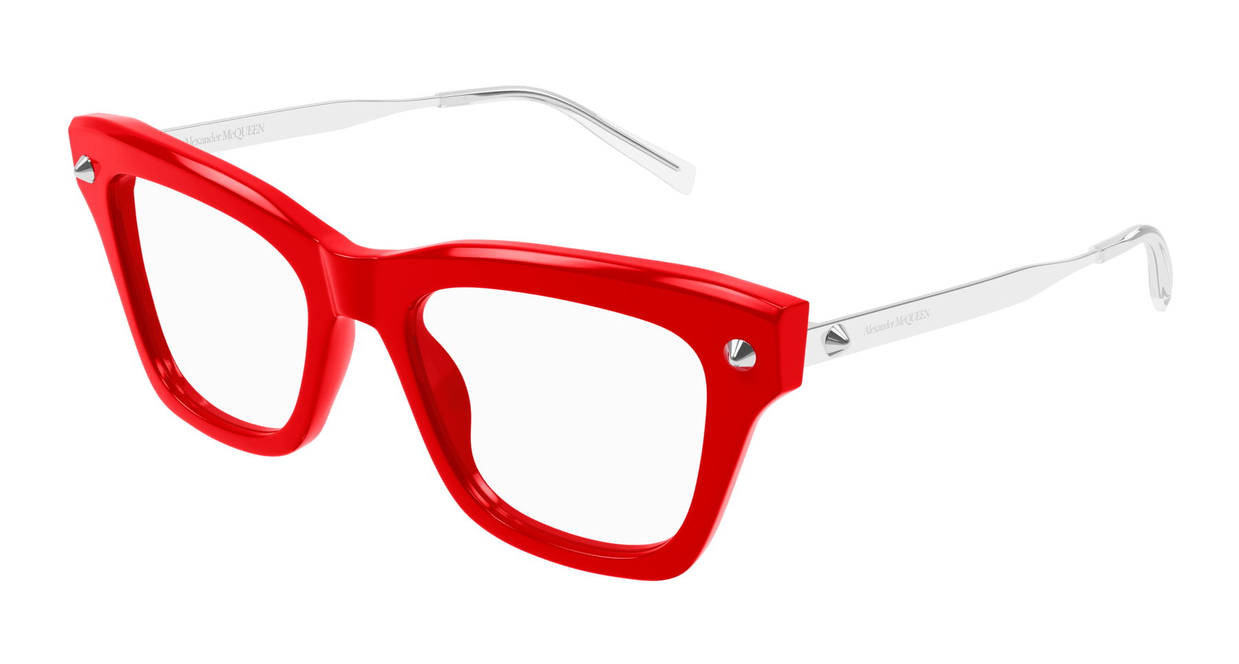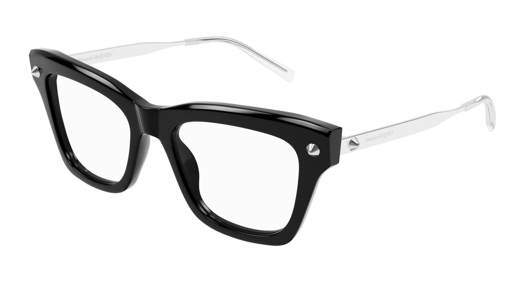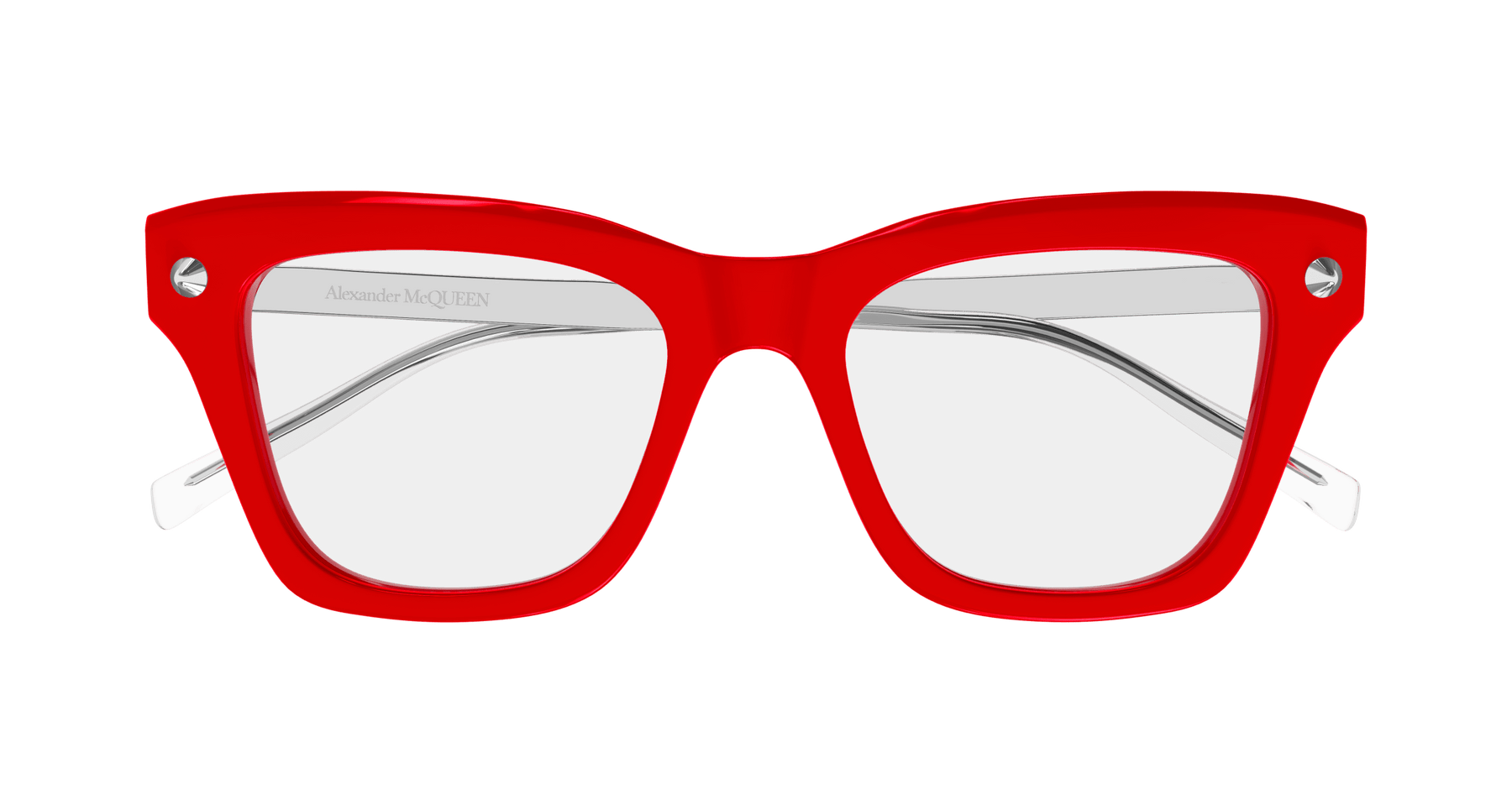 As a strong recognizable iconic detail, studs are central to the fashion house representing a full expression of rebellion at the heart of the McQueen spirit. Feminine large cat eye acetate front enriched with iconic spike studs fully integrated as functional element of the hinge construction combined with metal temples. The Alexander McQueen logo is lasered on the temples tone on tone.