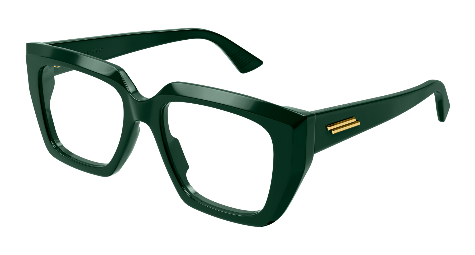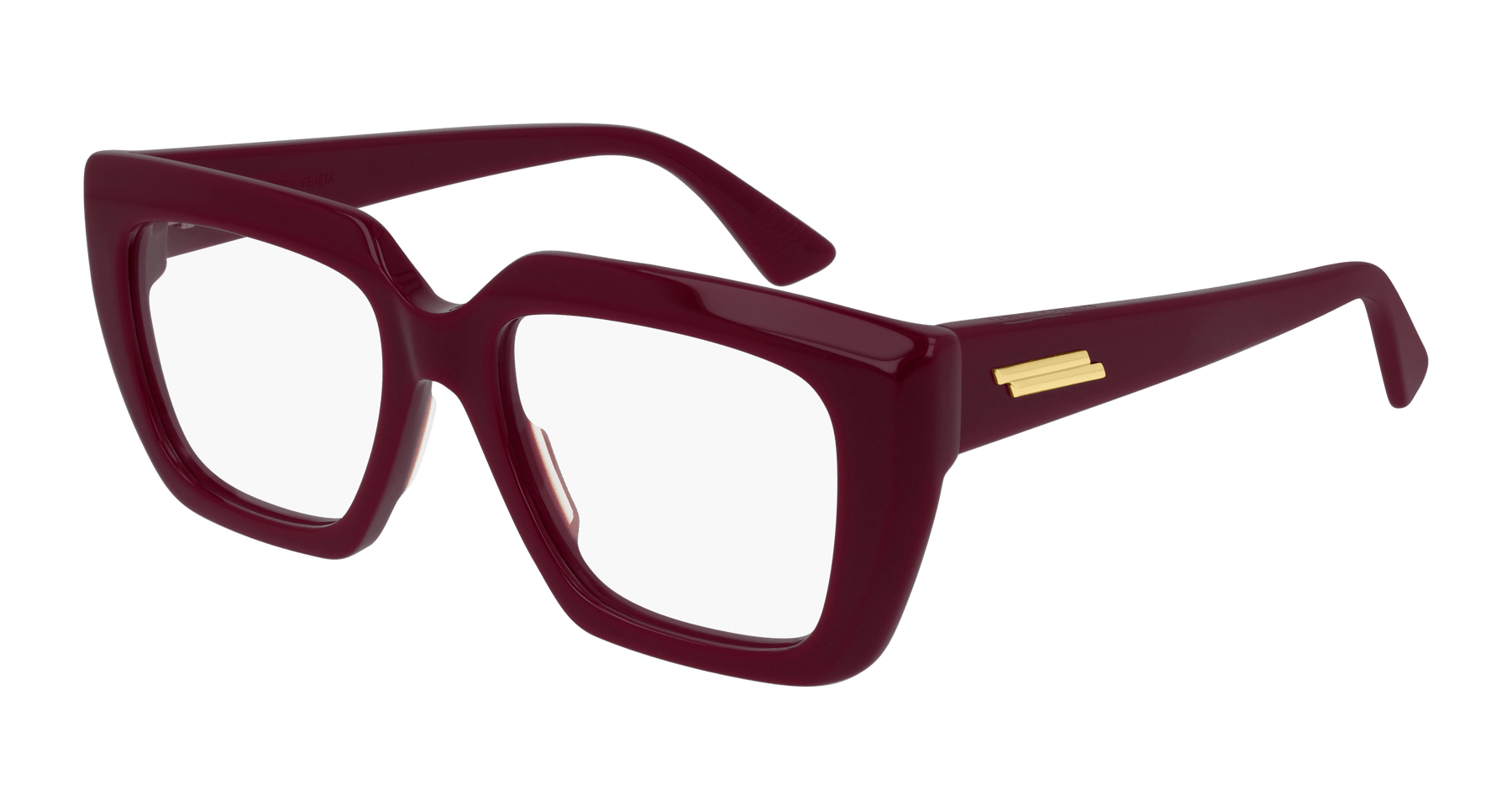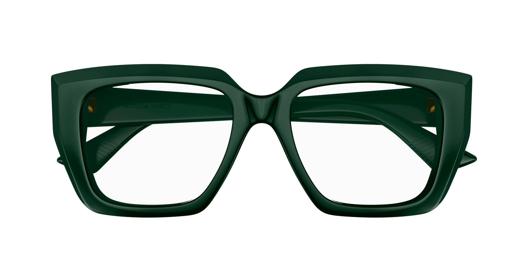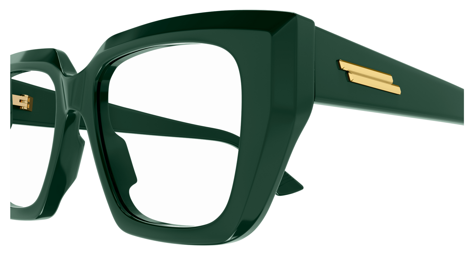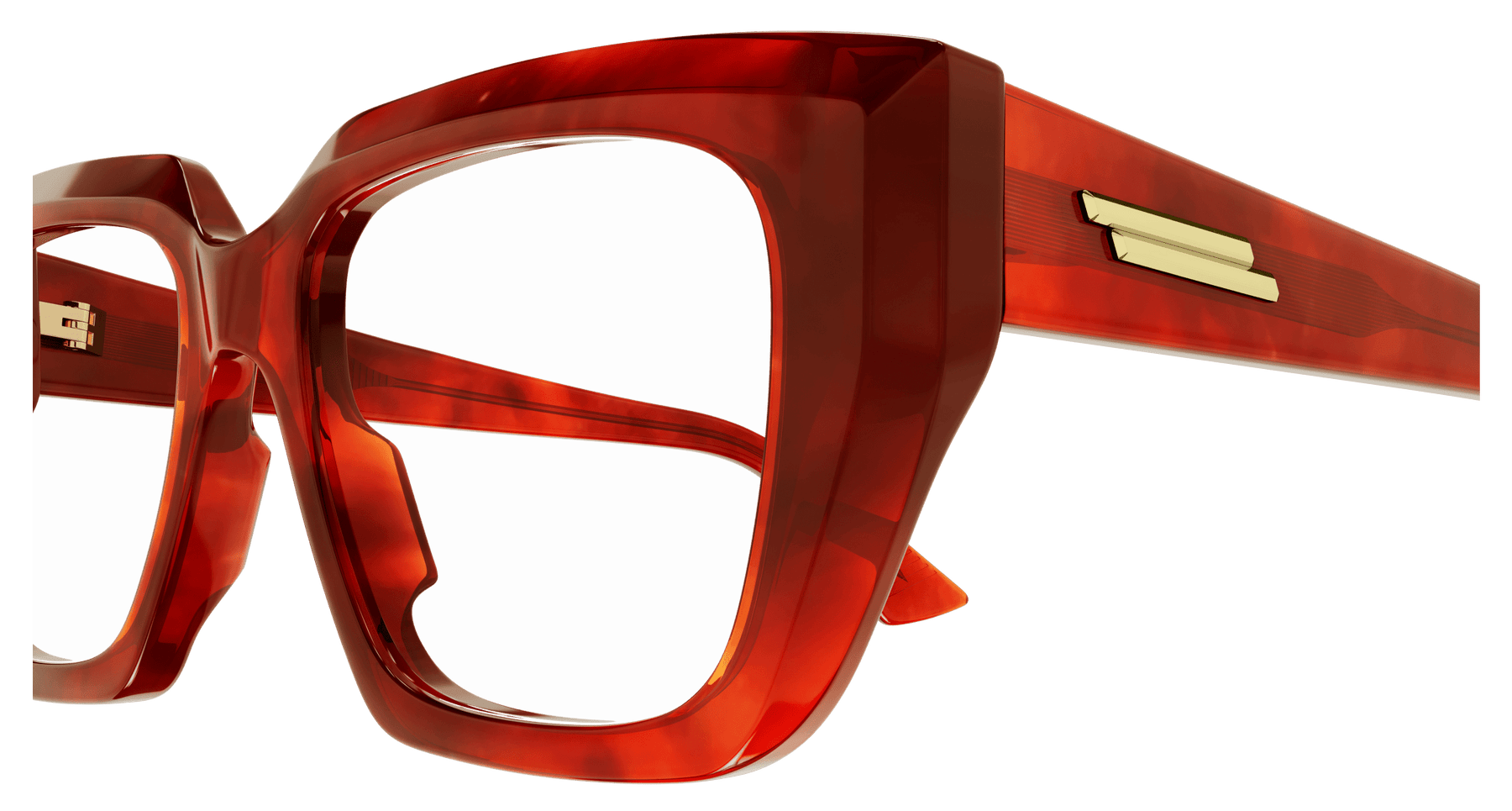 Full acetate feminine squared style characterized by sharp and bold volumes and smooth surfaces. Emphasized faceting of acetate surfaces, thanks to the handmade manufacturing. Geometrical temple shape enriched by the new iconic 3dimensional fringed ribbon metal emblem in long version. Bottega Veneta logo lasered and enameled on the external side of the left temple. Anti slipping details on the internal part of the endtips.