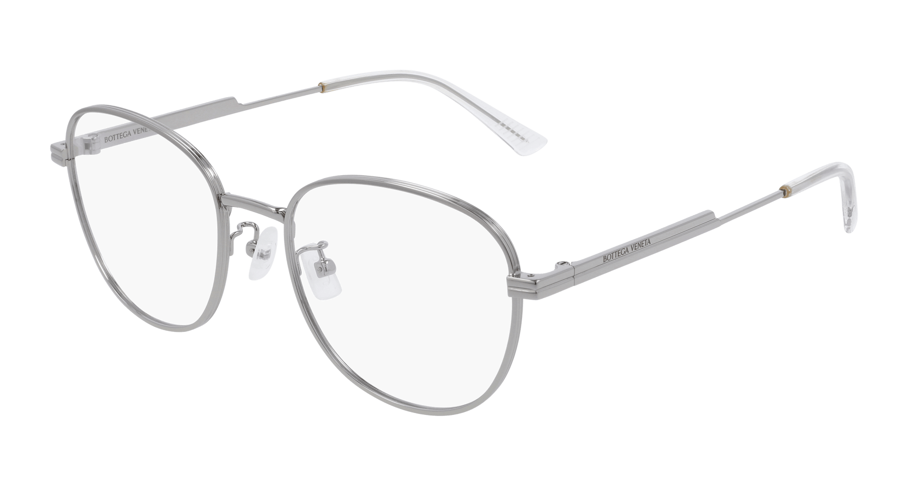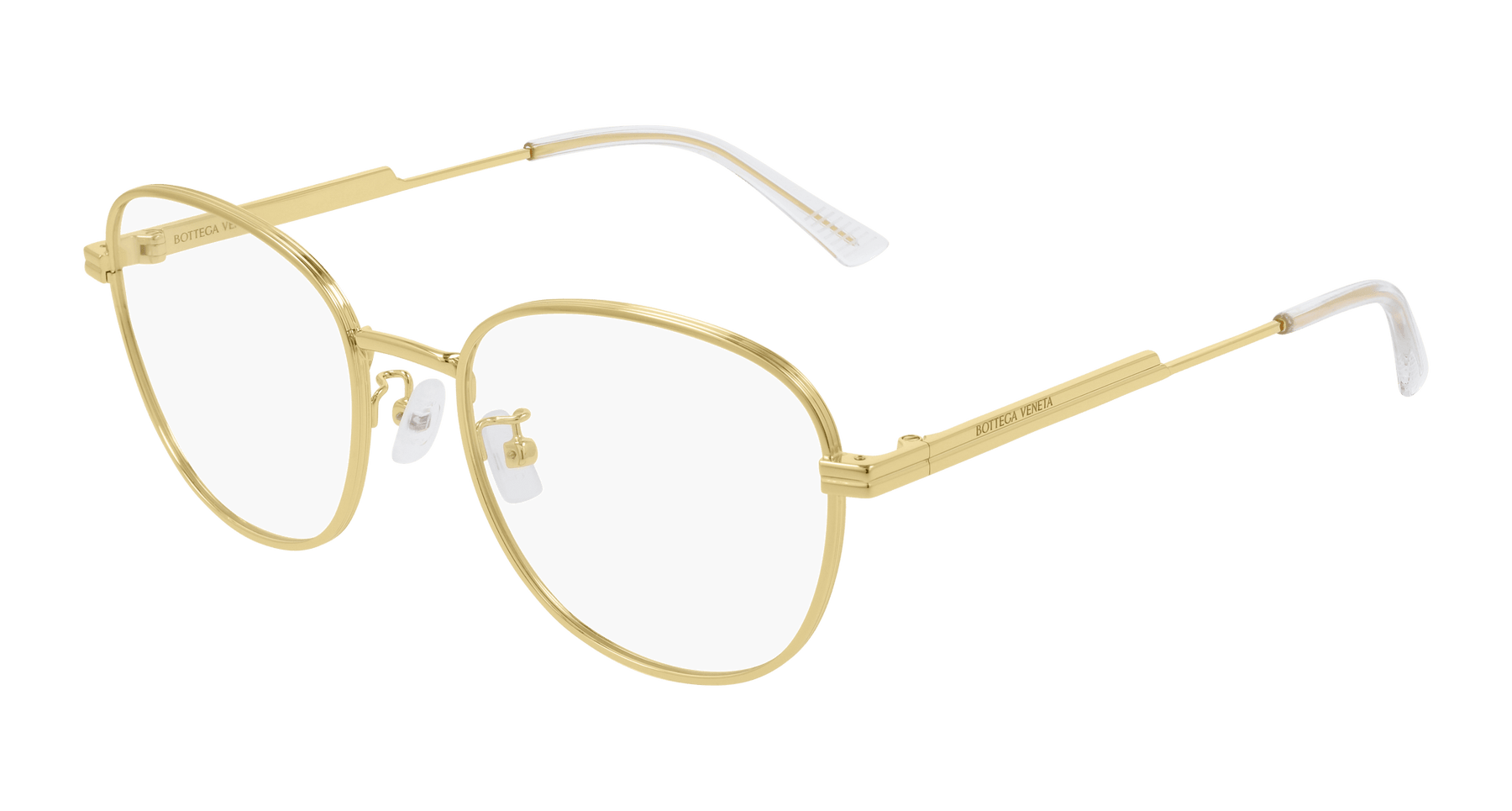 Full metal and super light feminine soft butterfly shape, available in double size (53, 57). Metal temples embellished by the new iconic fringed ribbon detail. Bottega Veneta logo finely laser engraved on the external side of temples. Injected transparent endtip to enhance the comfort. Color palette characterized by shiny metals and enriched with new rose gold nuance for a feminine touch.