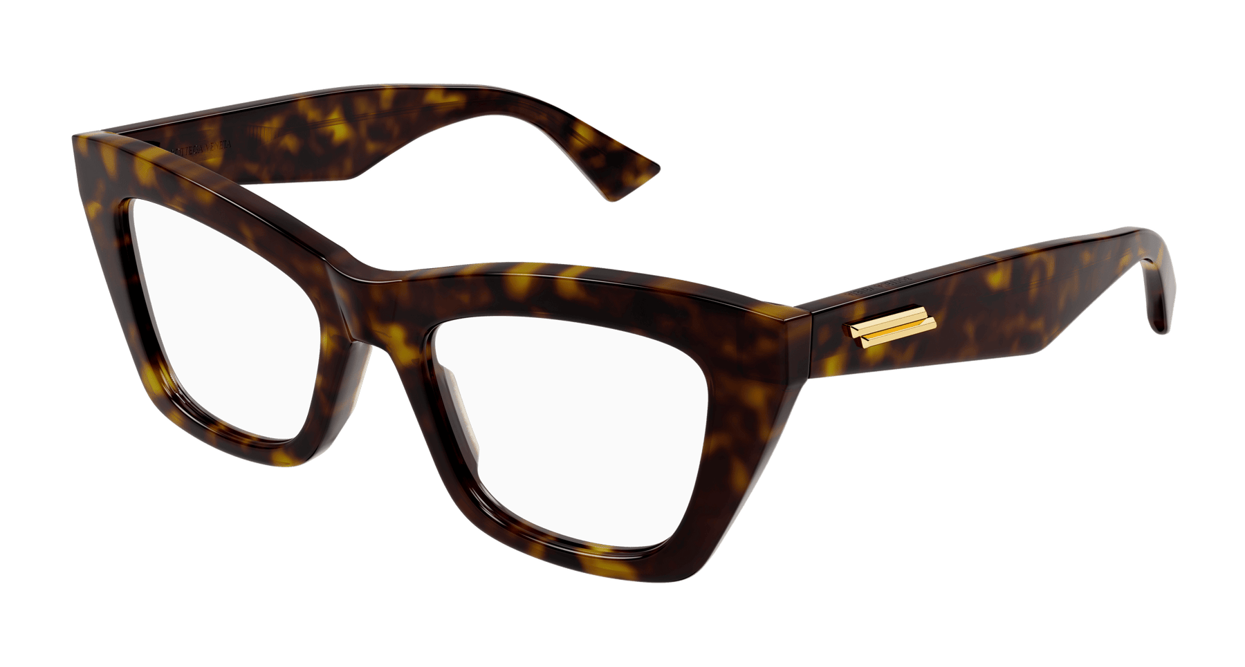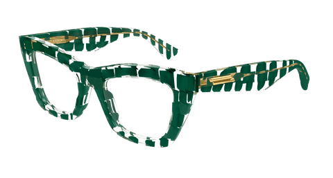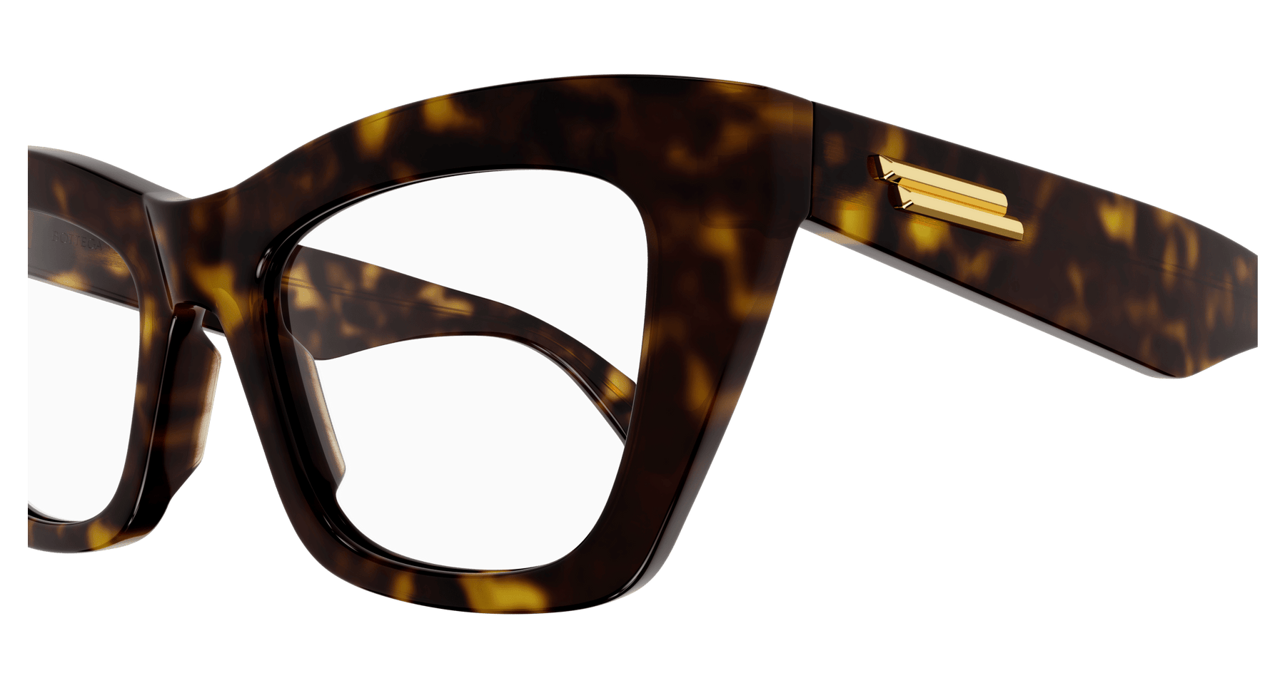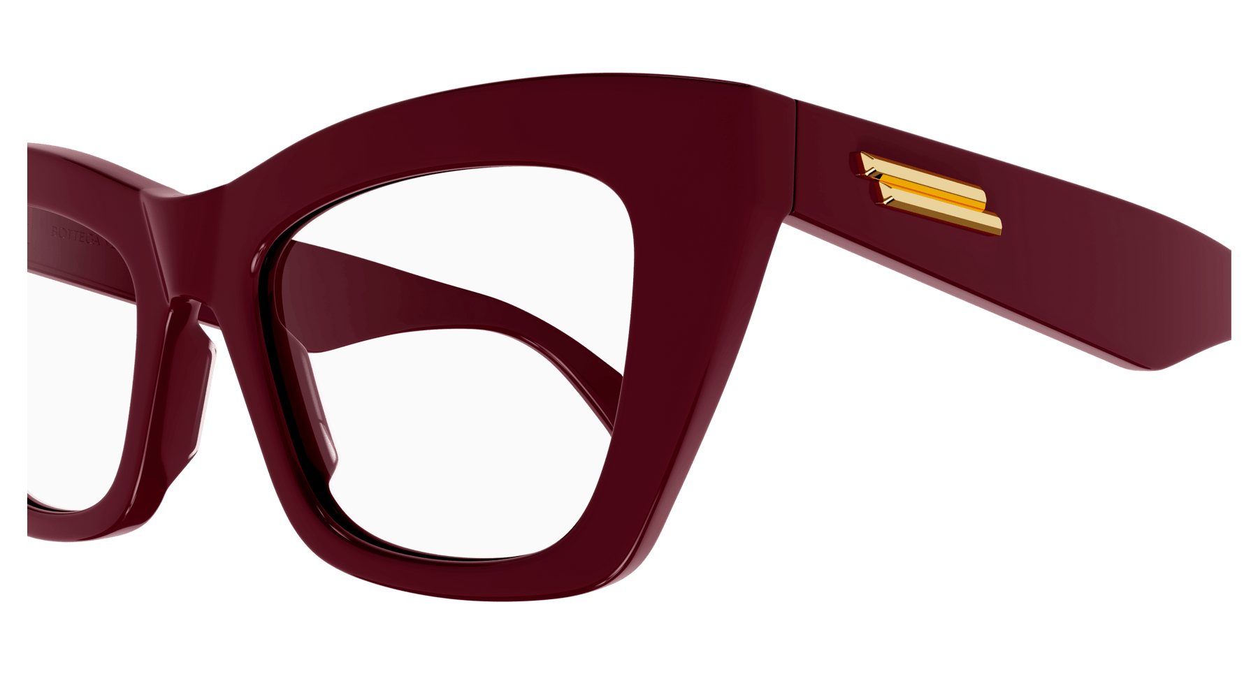 Full acetate feminine soft cat-eye style characterized by sharp and bold volumes. Geometrical temple shape enriched by the iconic metal fringed ribbon. Bottega Veneta logo on the top of the temple.