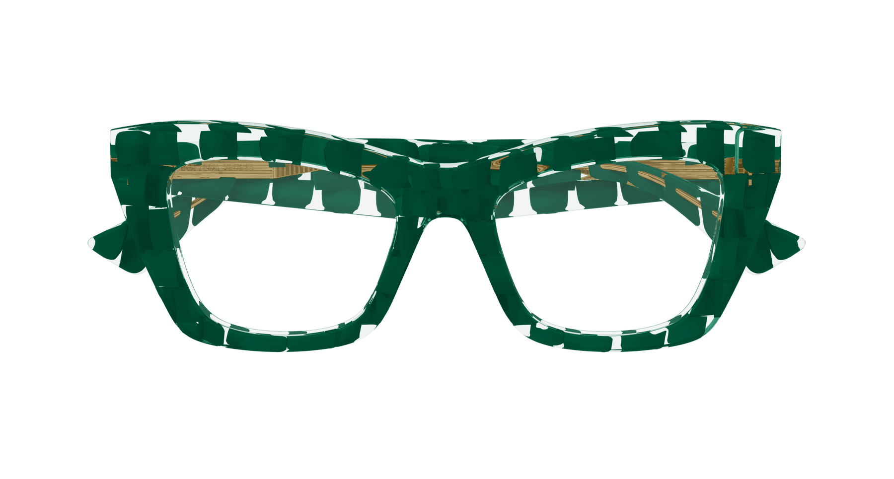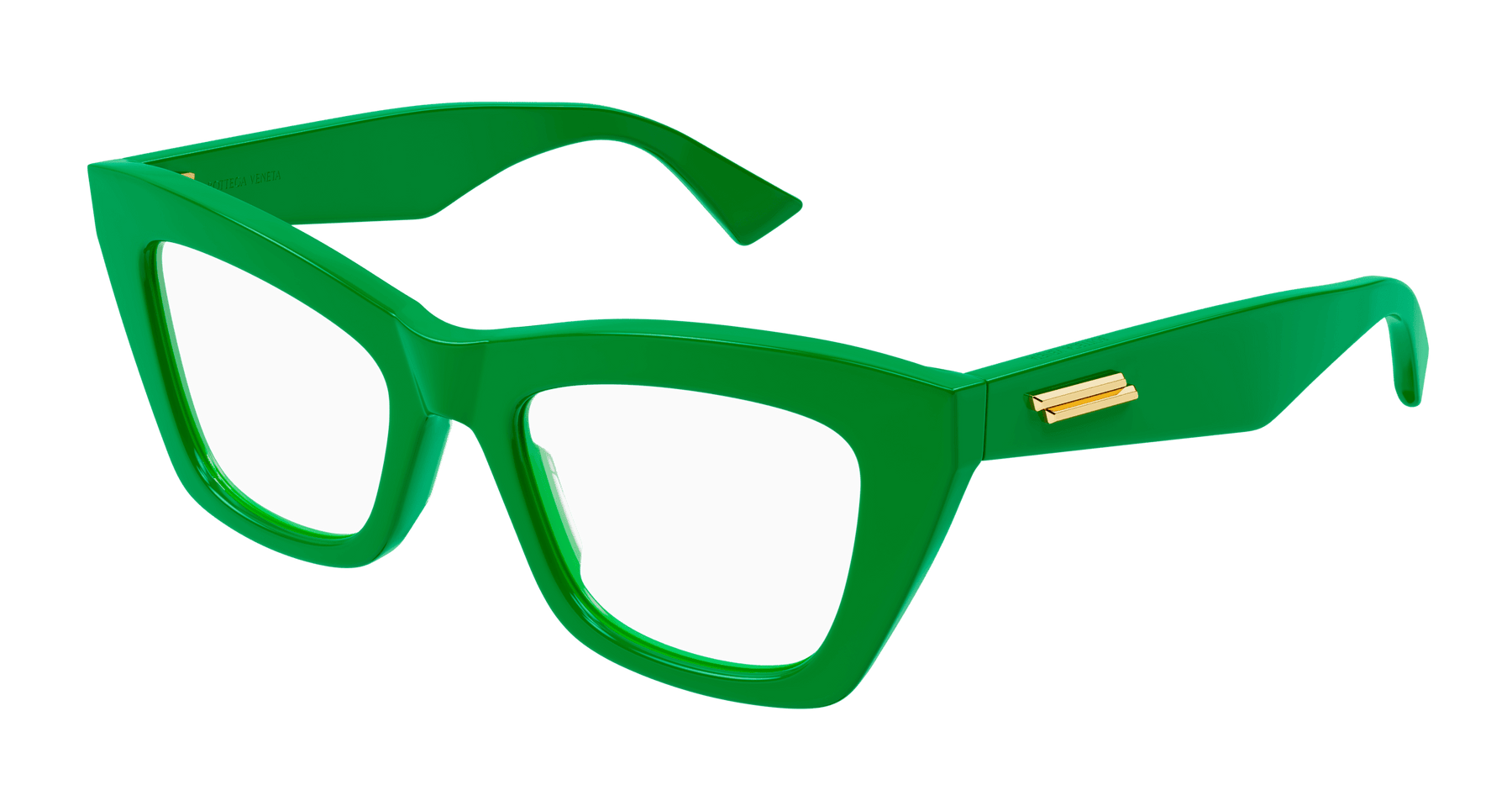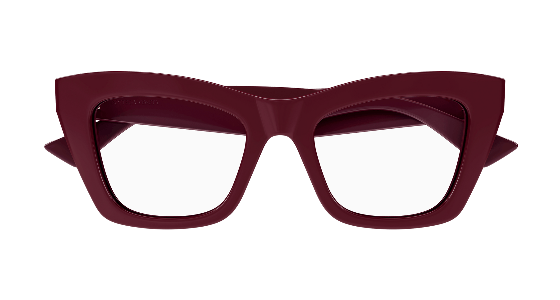 Full acetate feminine soft cat-eye style characterized by sharp and bold volumes. Geometrical temple shape enriched by the iconic metal fringed ribbon. Bottega Veneta logo on the top of the temple.