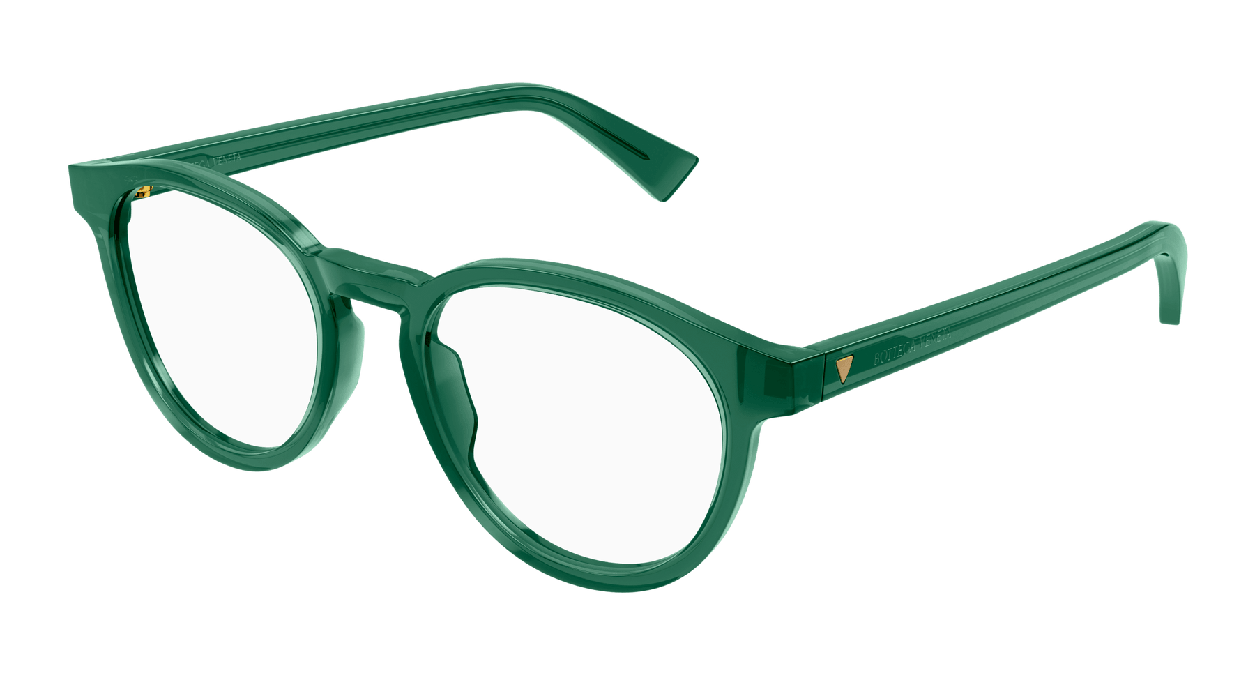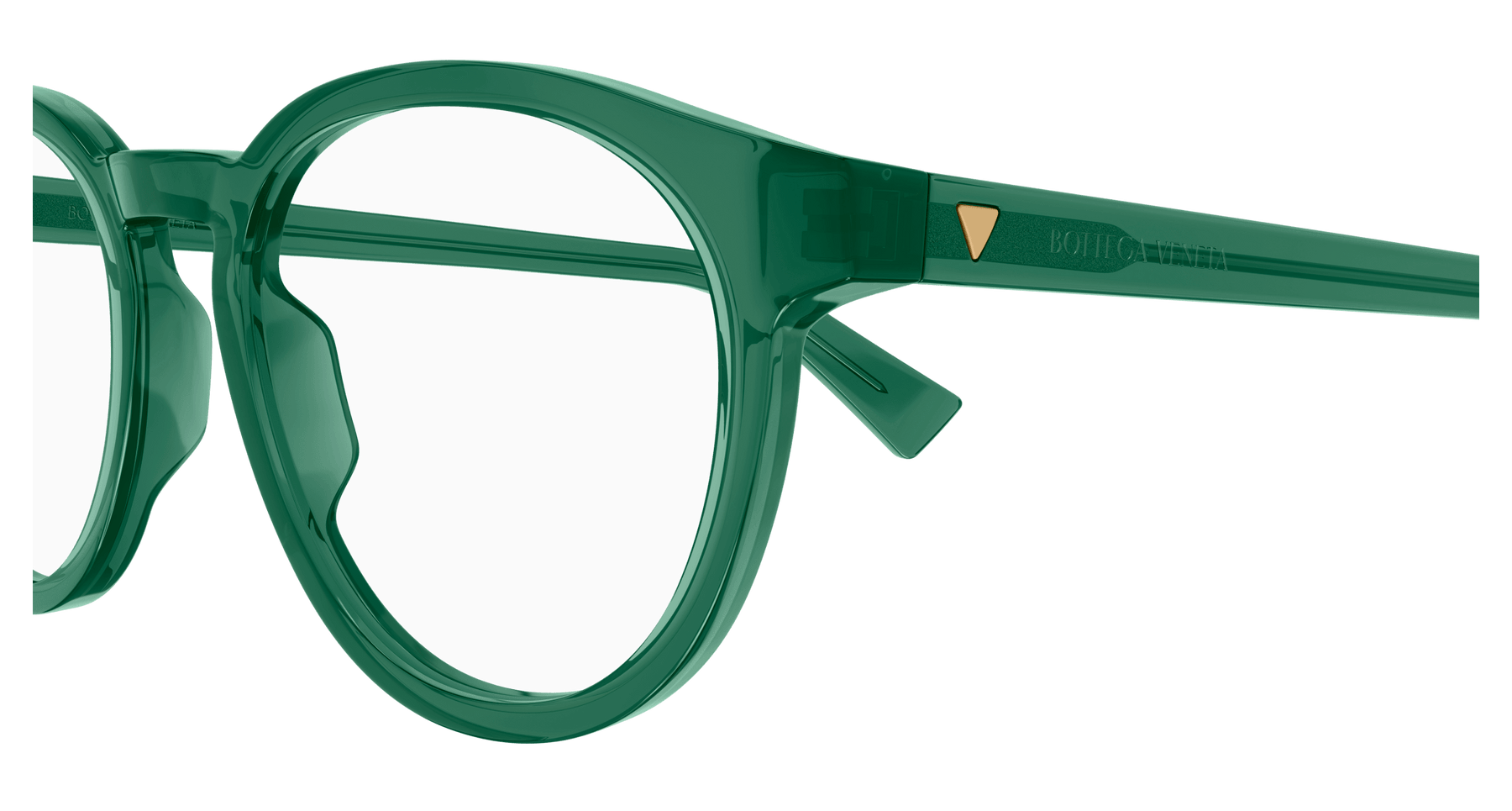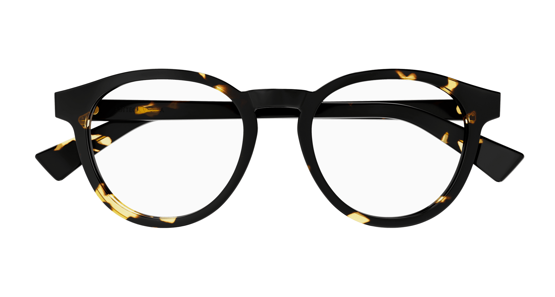 Full acetate and light unisex pantos style. Triangular metal stud on temple. Bottega Veneta logo on temple.
