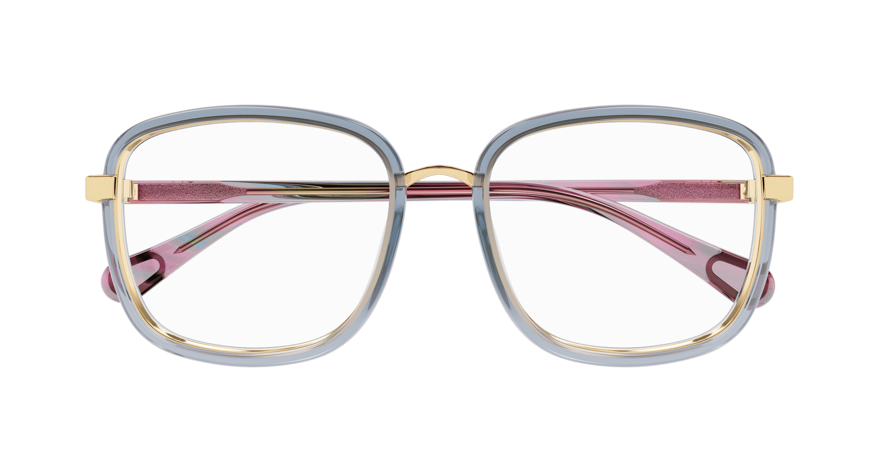 Squared combi frame, kids version of one of the Chloé Best Selling Women’s style. Metal nose bridge and metal gold griffe that liaise the front rim to the temple. Hot stamping logo on the left one. Thin plastic frame enhanced by playful colors.