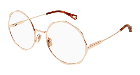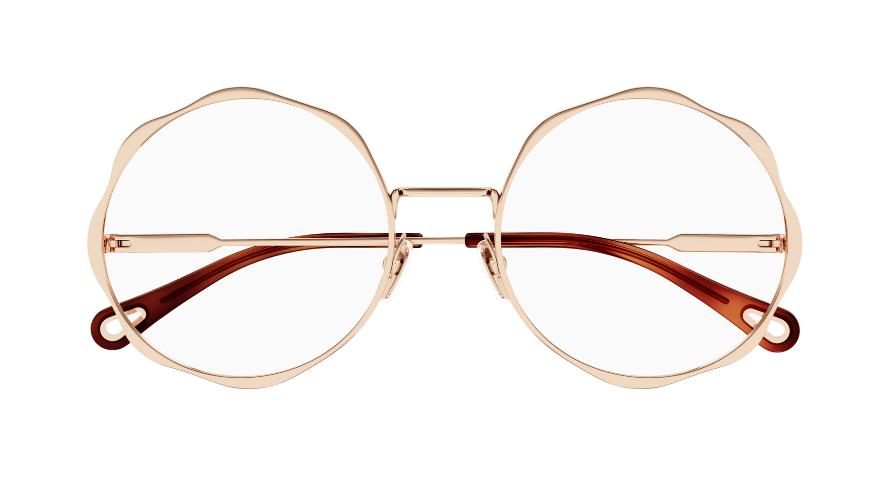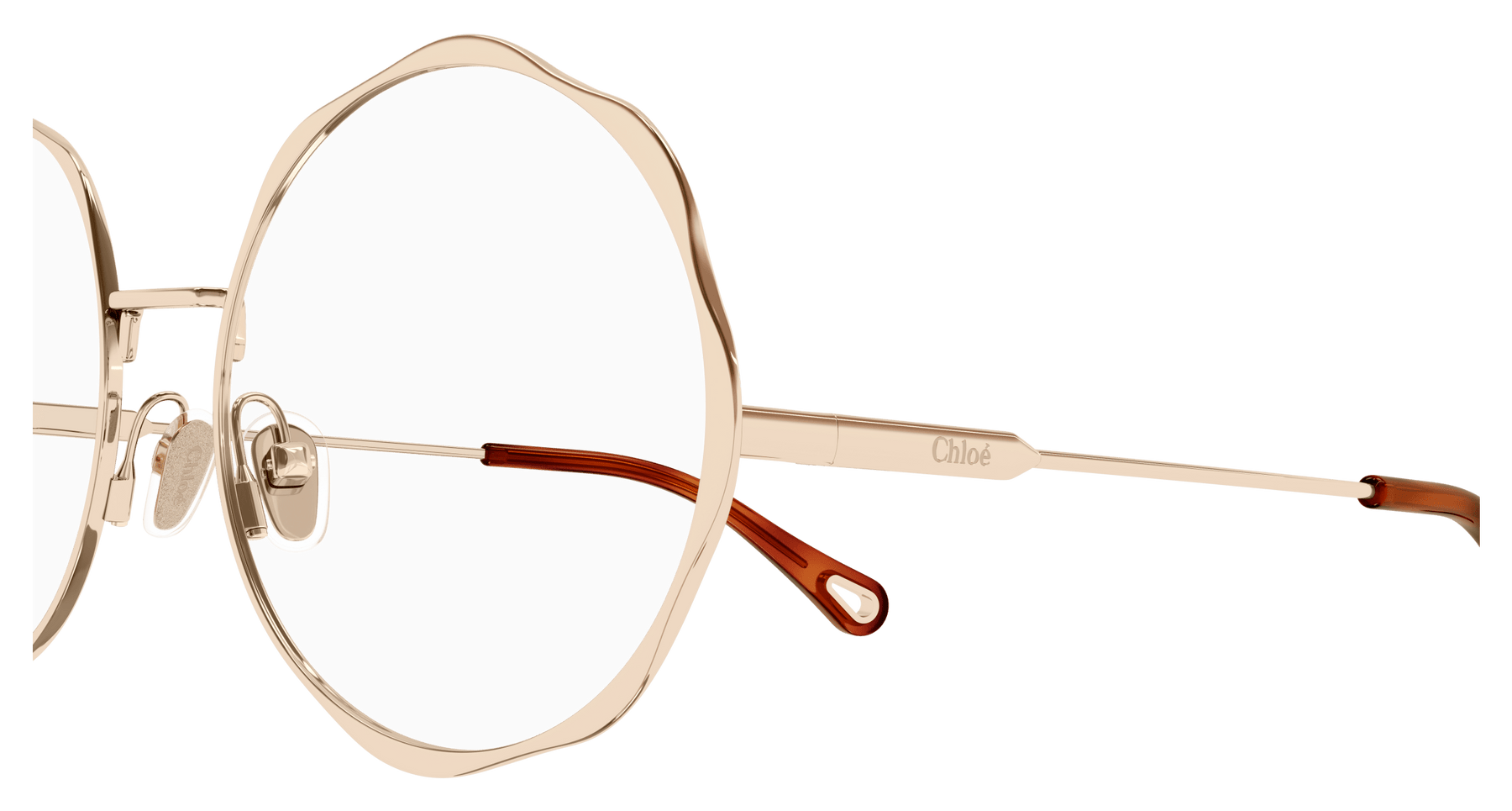 Round frame with a gold metal rim featuring the scallop detail around the front for a classic Chloé bohemian flair. Iconic teardrop cut out on the temple tip.