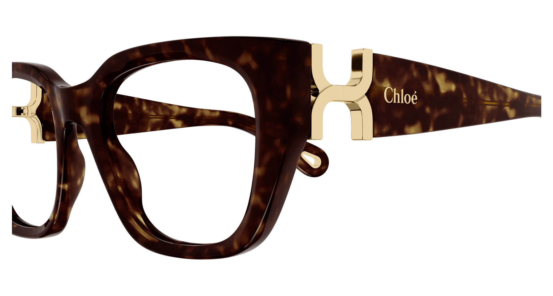 Cat Eye shape frame in acetate. Marcie gold metal logo as a functional hinge. Solid colors inspired from Chloé SS24 RTW collection.