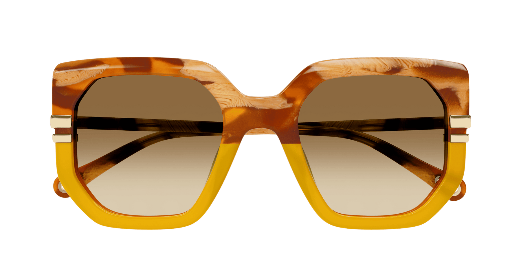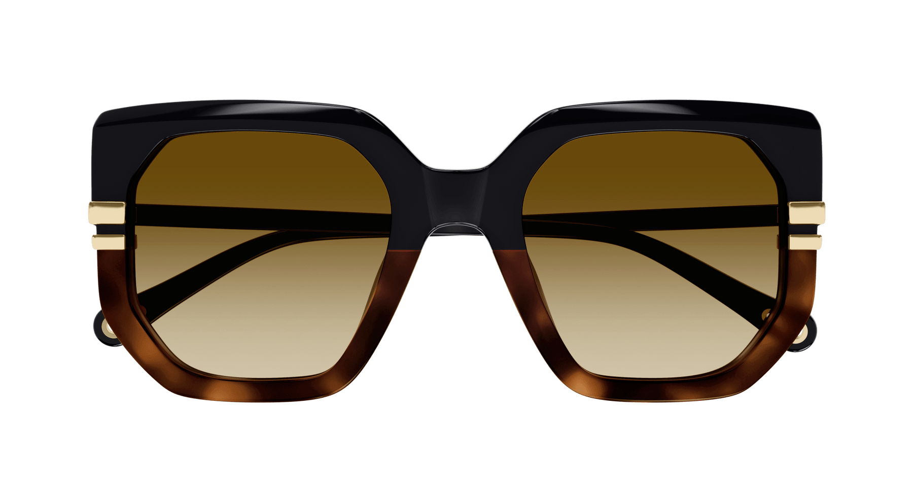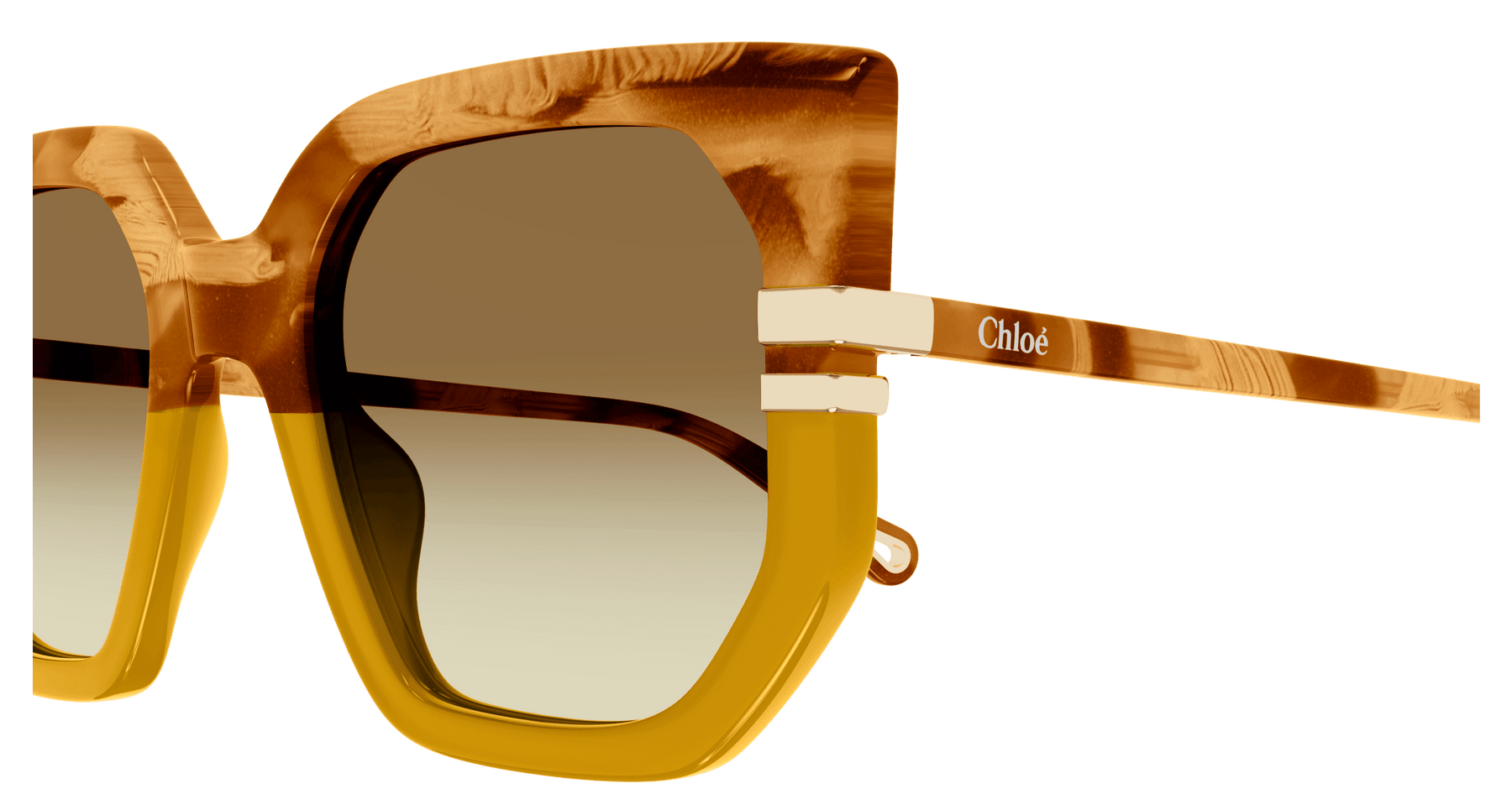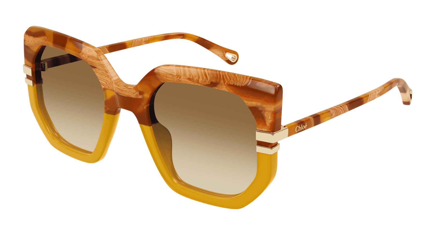 New West style reinterpreted in an oversized squared with bold profiles. Gold rounded metal interts on the front.. Mix of bi color skus with new honey, and green shades.